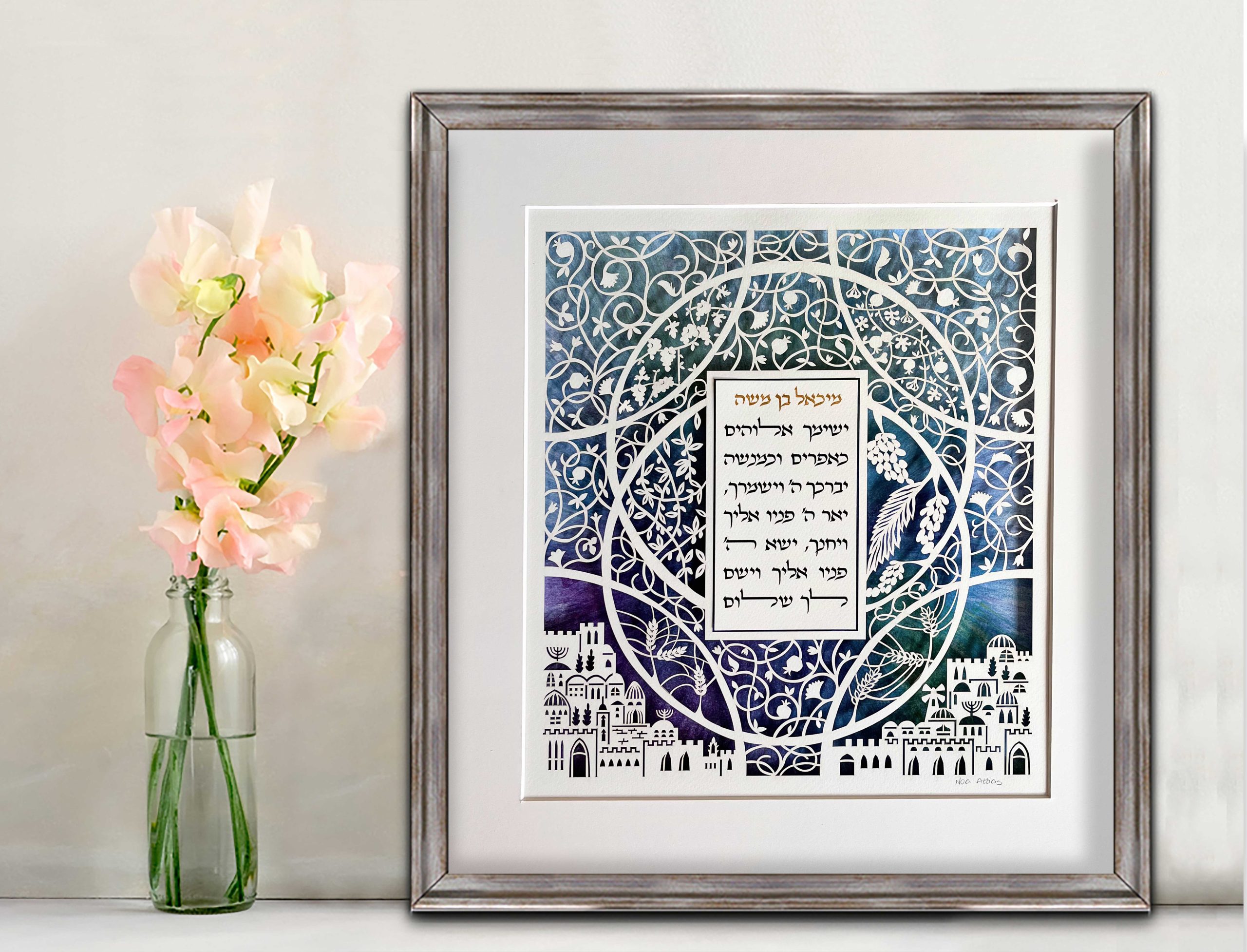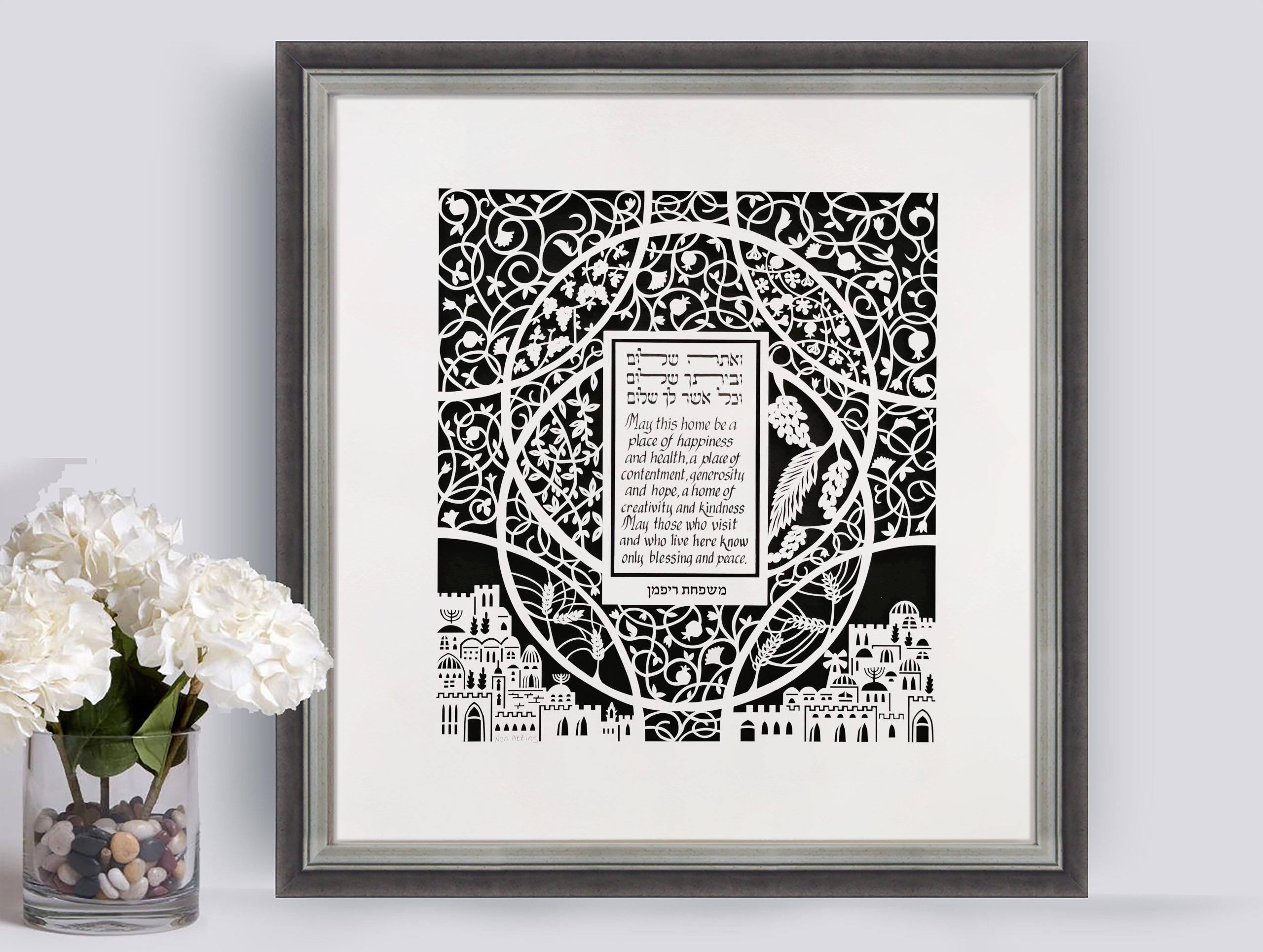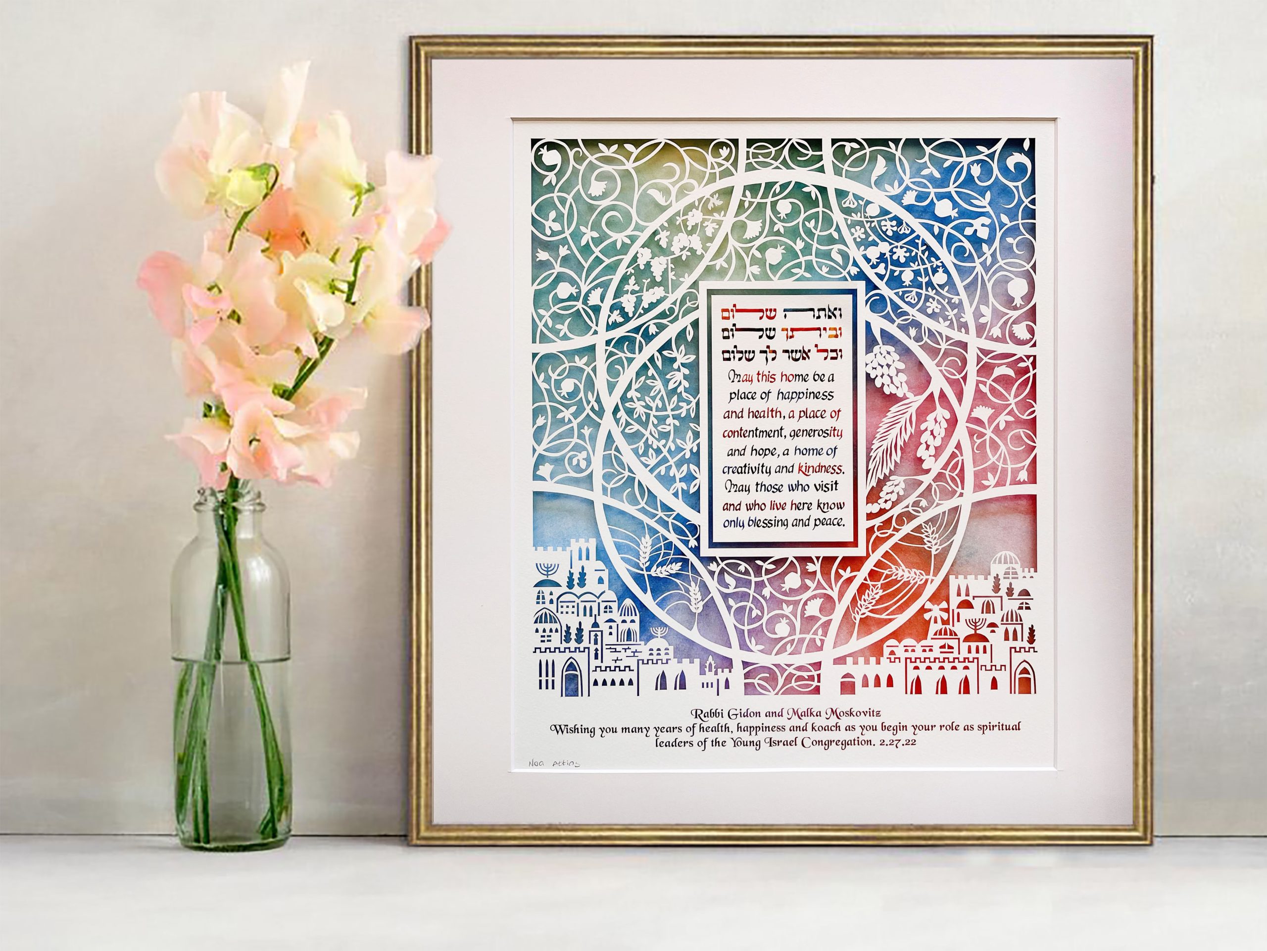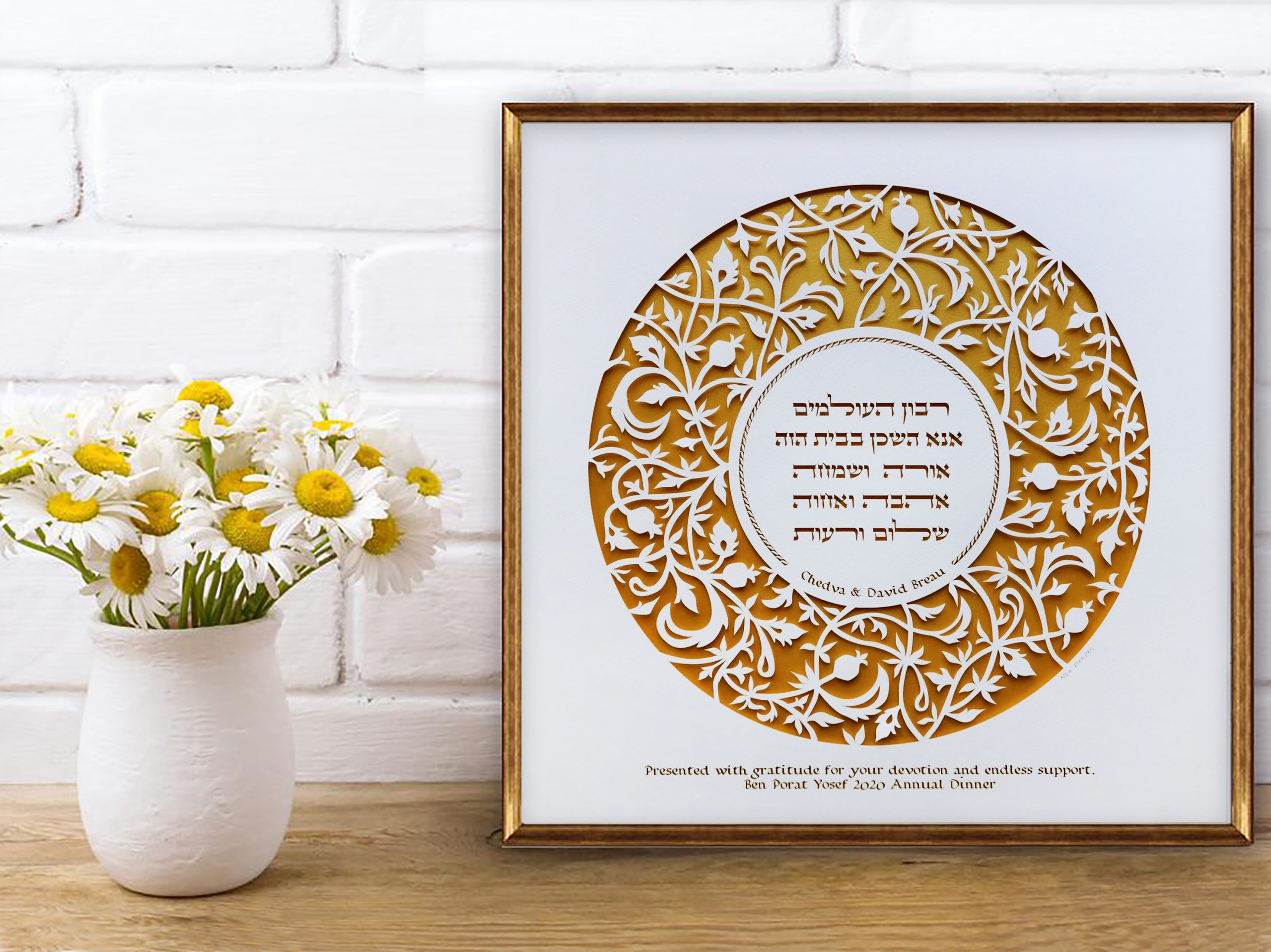 Show your loved ones how much you care with meaningful Judaica papercut art. A custom piece of art makes a unique and memorable gift. Is your school, synagogue or organization hosting a banquet? These papercuts also make the perfect gift for a Rabbi, Jewish community leader, teacher, major donor, or as a token of appreciation for service or achievement.