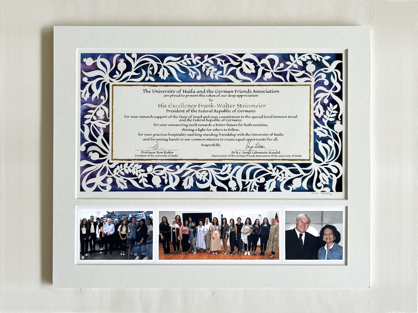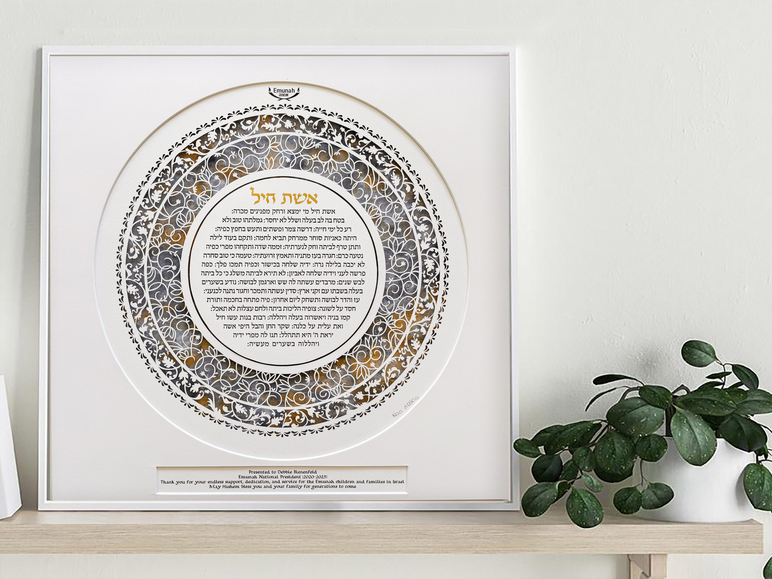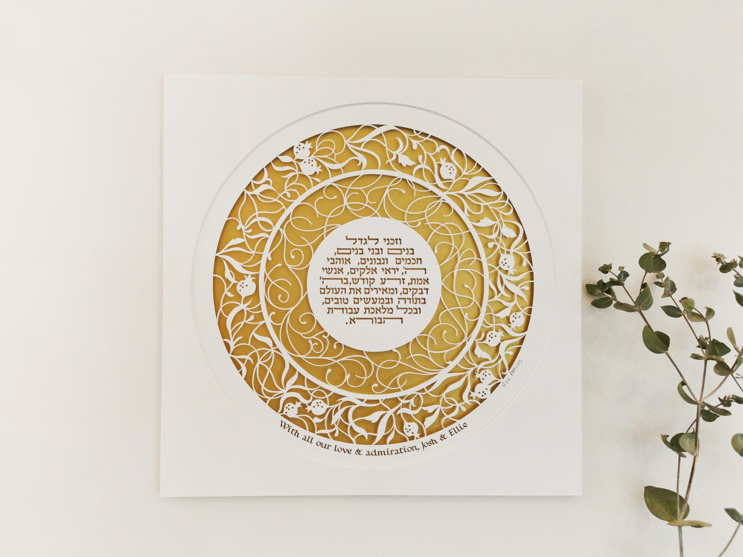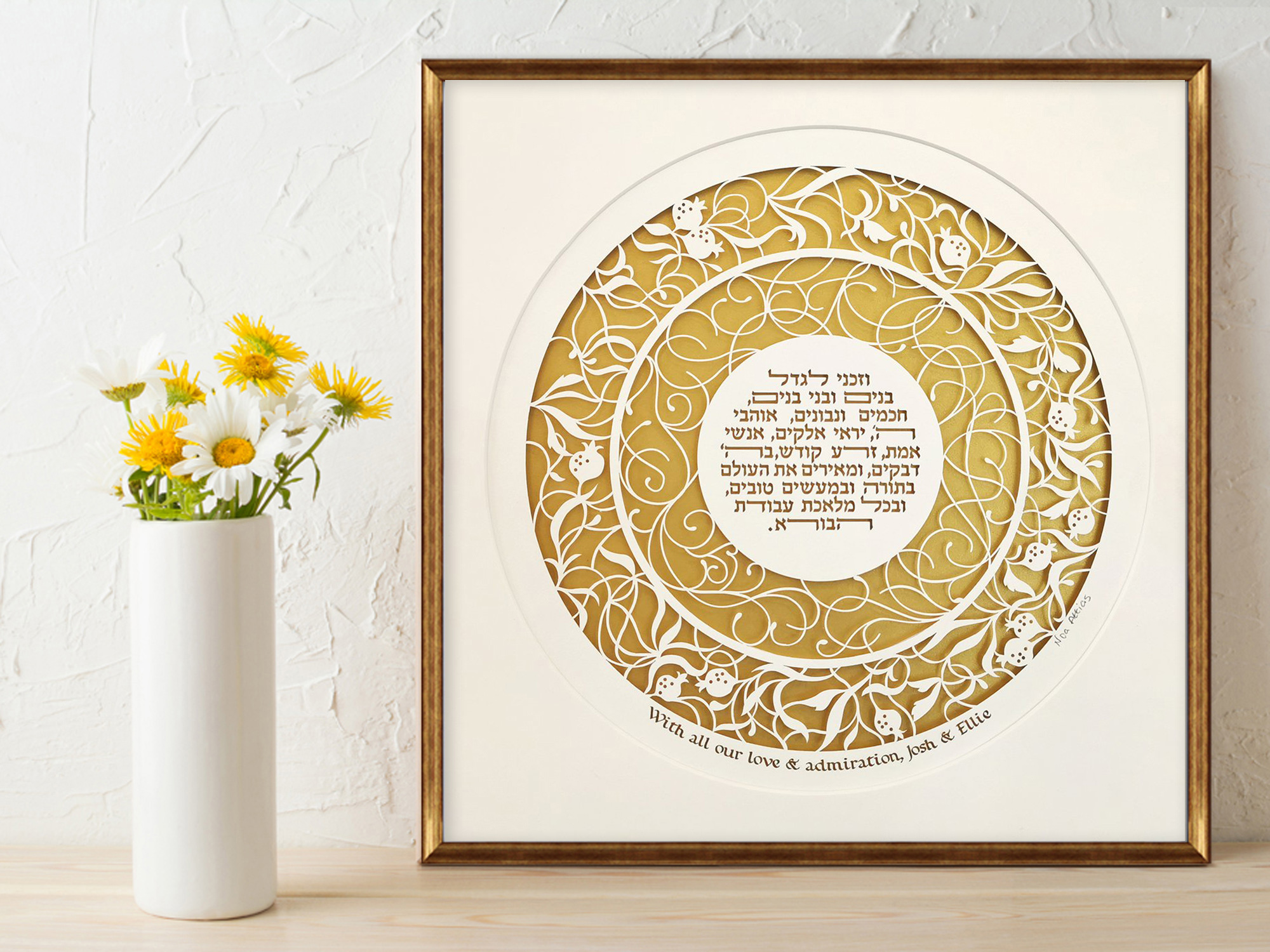 Show your loved ones how much you care with meaningful Judaica papercut art. A custom piece of art makes a unique and memorable gift. Is your school, synagogue or organization hosting a banquet? These papercuts also make the perfect gift for a Rabbi, Jewish community leader, teacher, major donor, or as a token of appreciation for service or achievement.