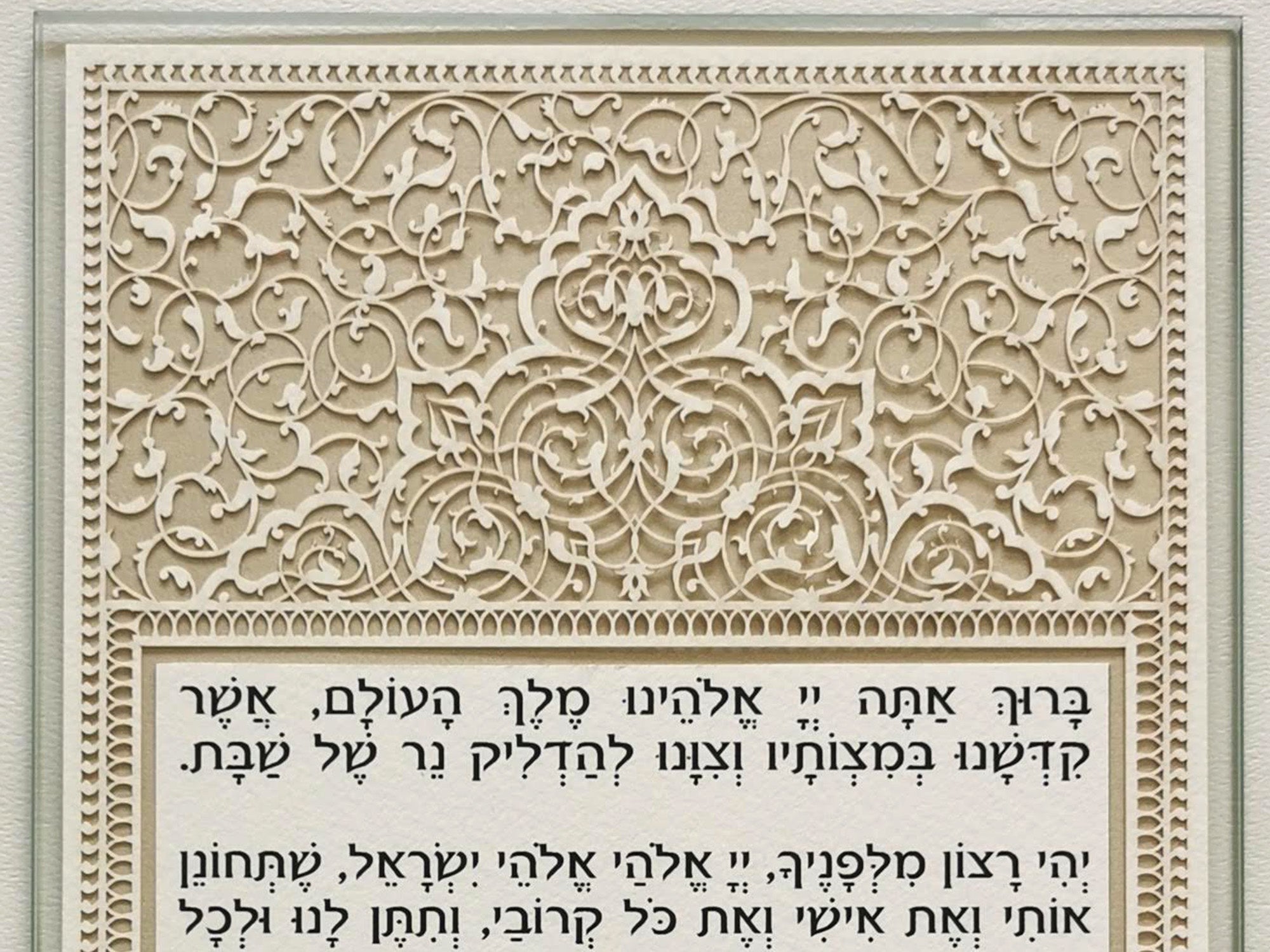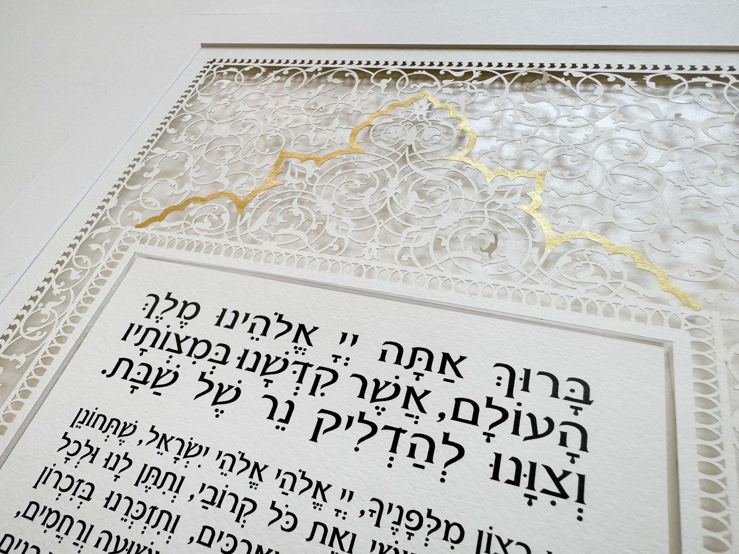 This intricate paper cut celebrates the SABBATH (SHABBAT) CANDLE-LIGHTING CEREMONY!
