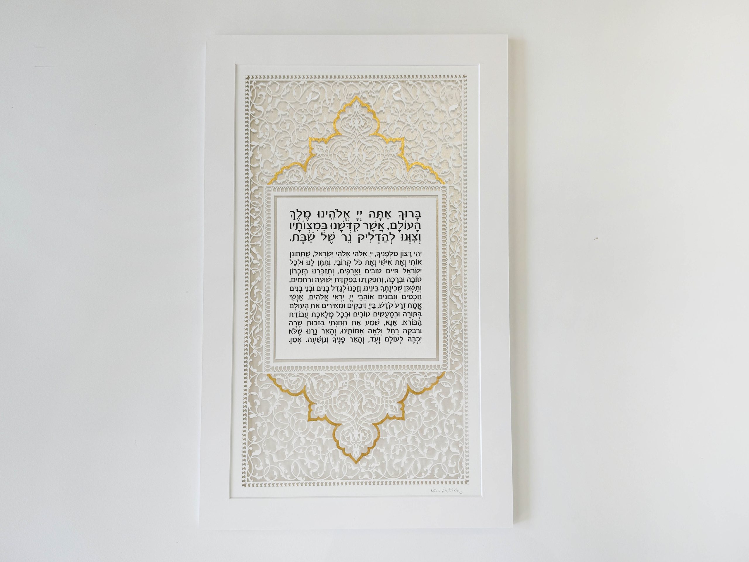 – 2-layer, paper cut of womans Shabbat candle-lighting prayer and background