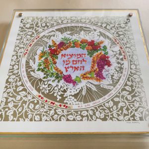 This beautiful Cutting Challah board made with a watercolor or 24k Gold border rim has a cut design with the central Blessing, “who brings forth bread from the earth” which is surrounded by the Blessing “You open your hand, and satisfy the desire of every living thing.”