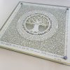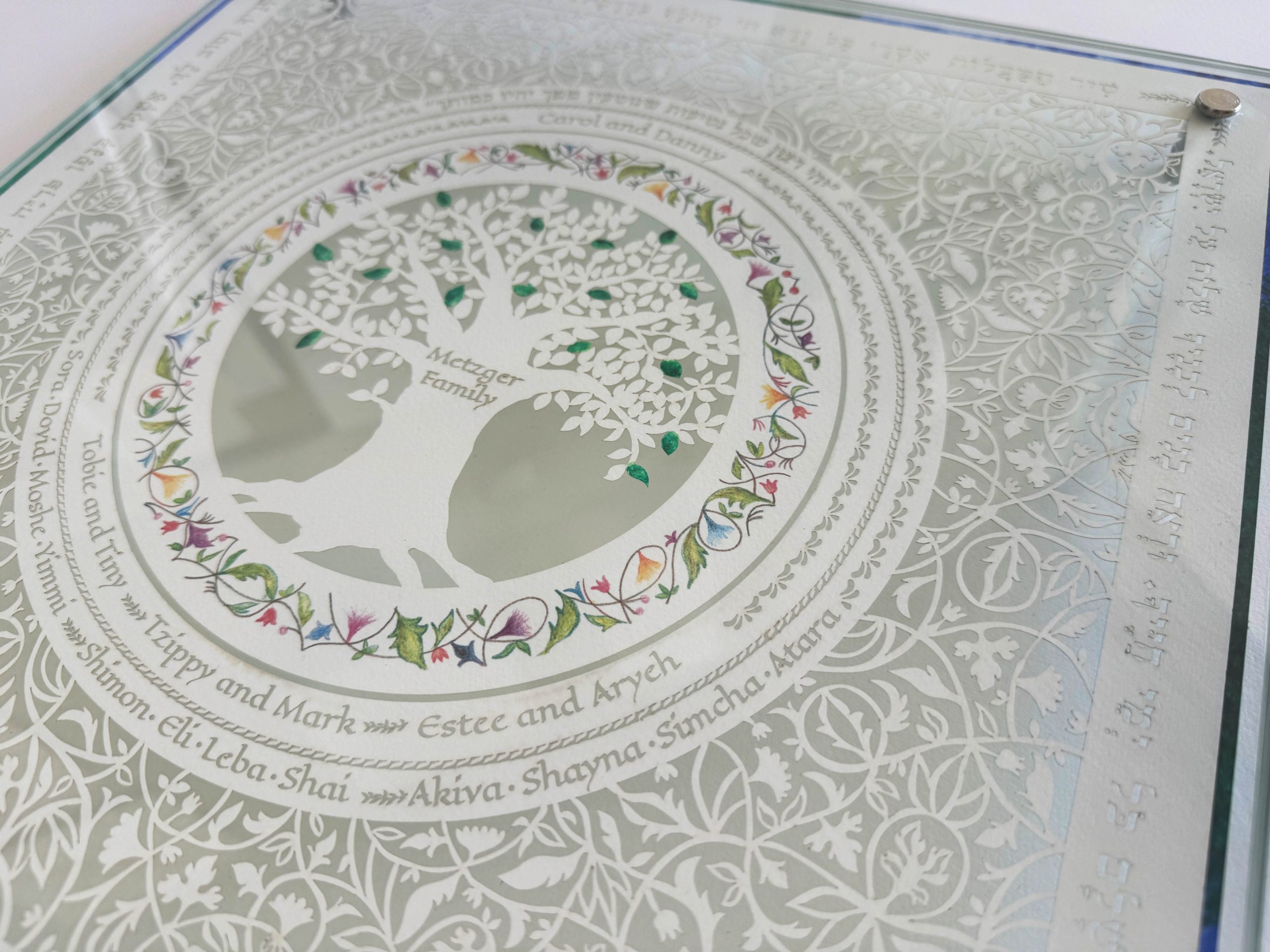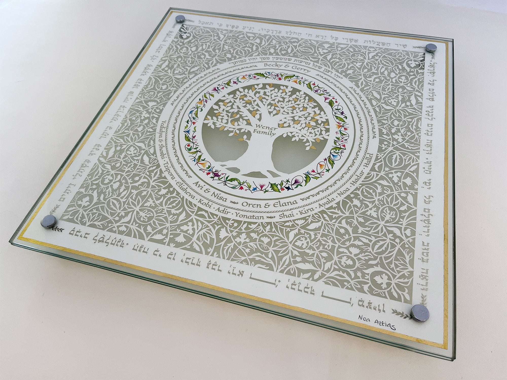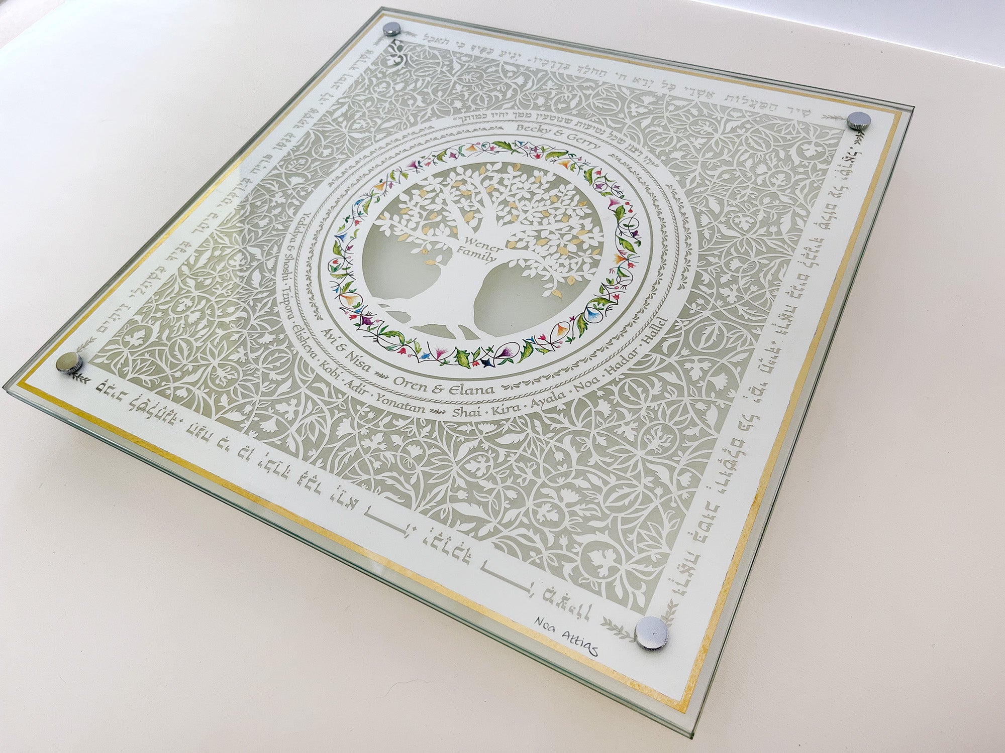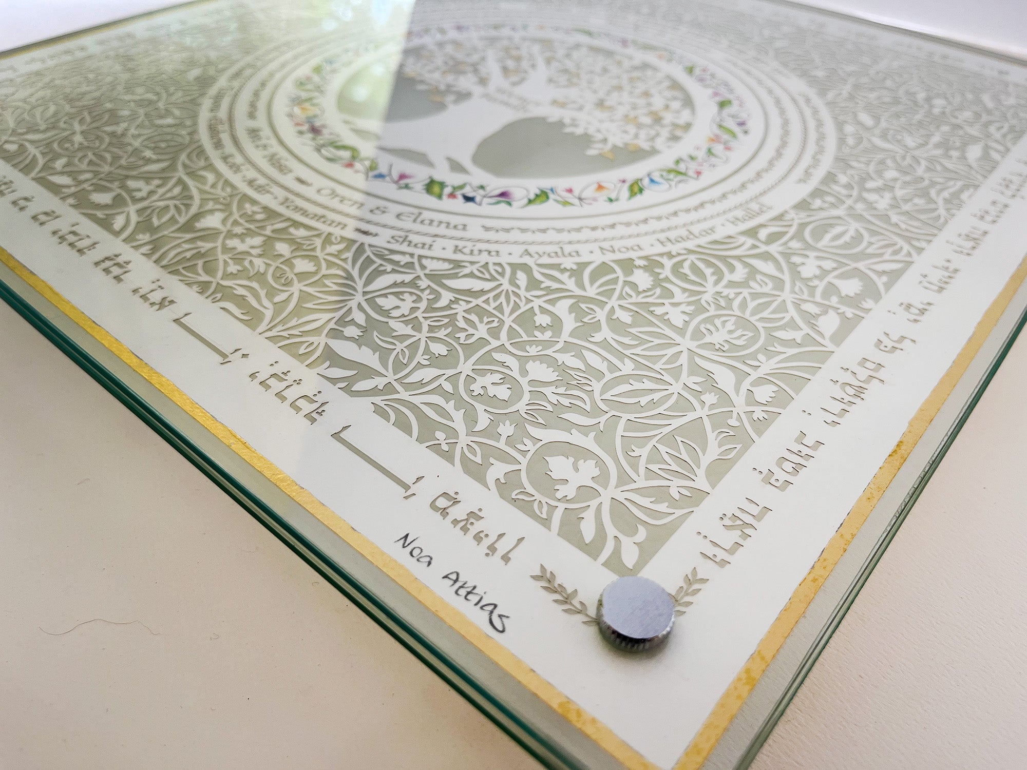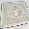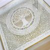 This beautiful Cutting Challah board made with a 24k Gold border rim has a cut design with your family members on it cut around a family tree that the leaves are gilded with 24K Gold.