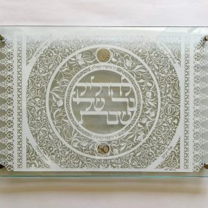 This beautiful Cutting Challah board made with a 24k Gold border rim has a cut design with the central Blessing, “who brings forth bread from the earth” which is surrounded by the Blessing “You open your hand, and satisfy the desire of every living thing.”