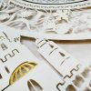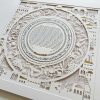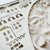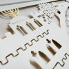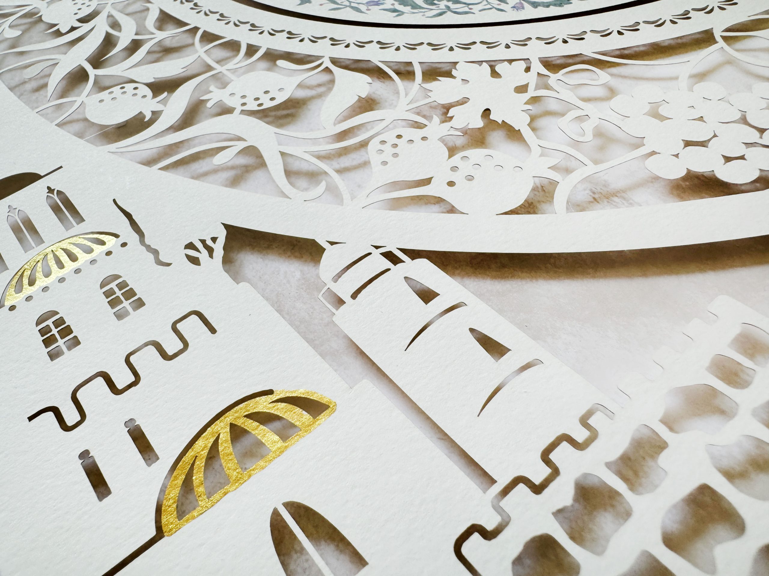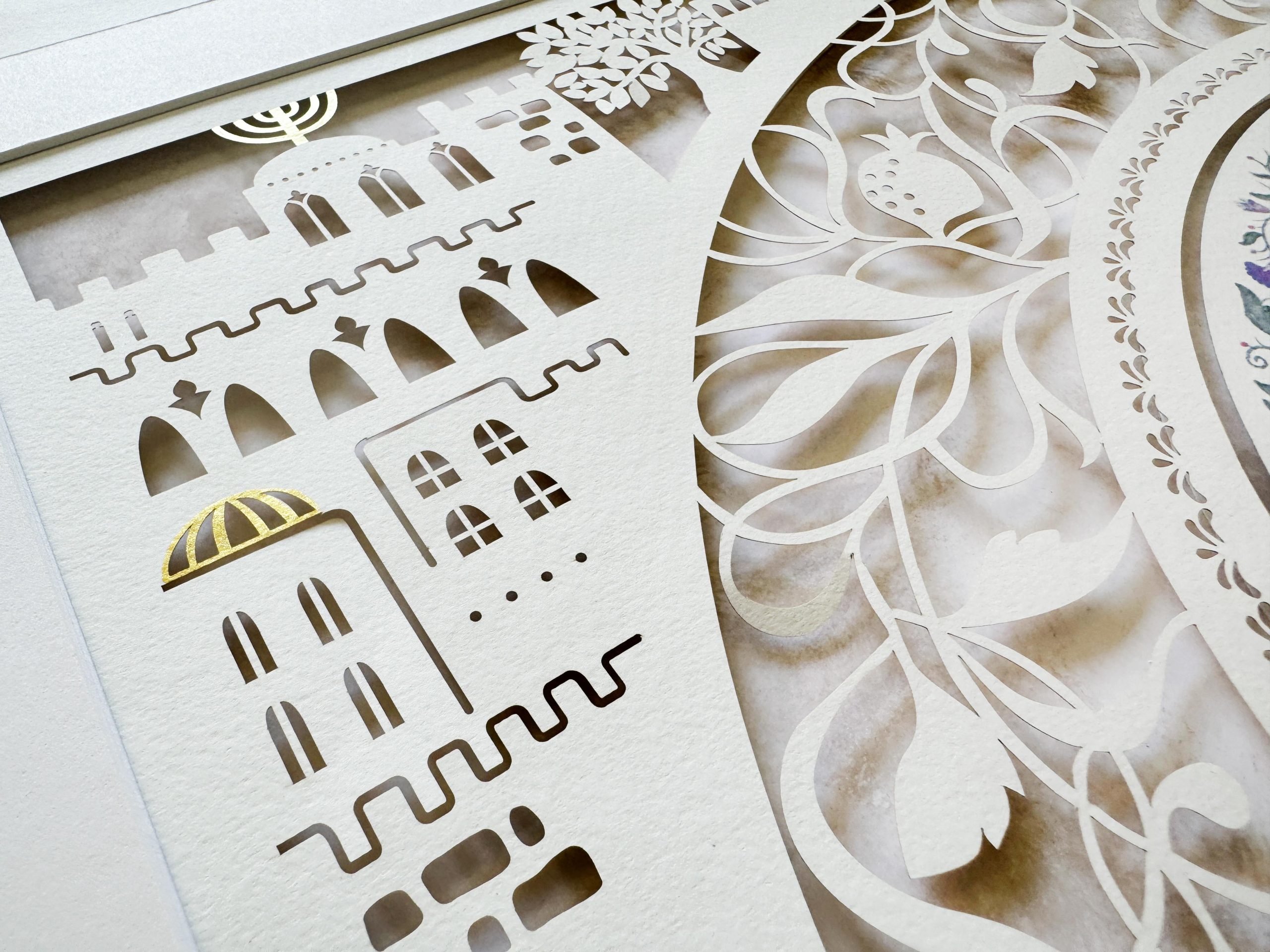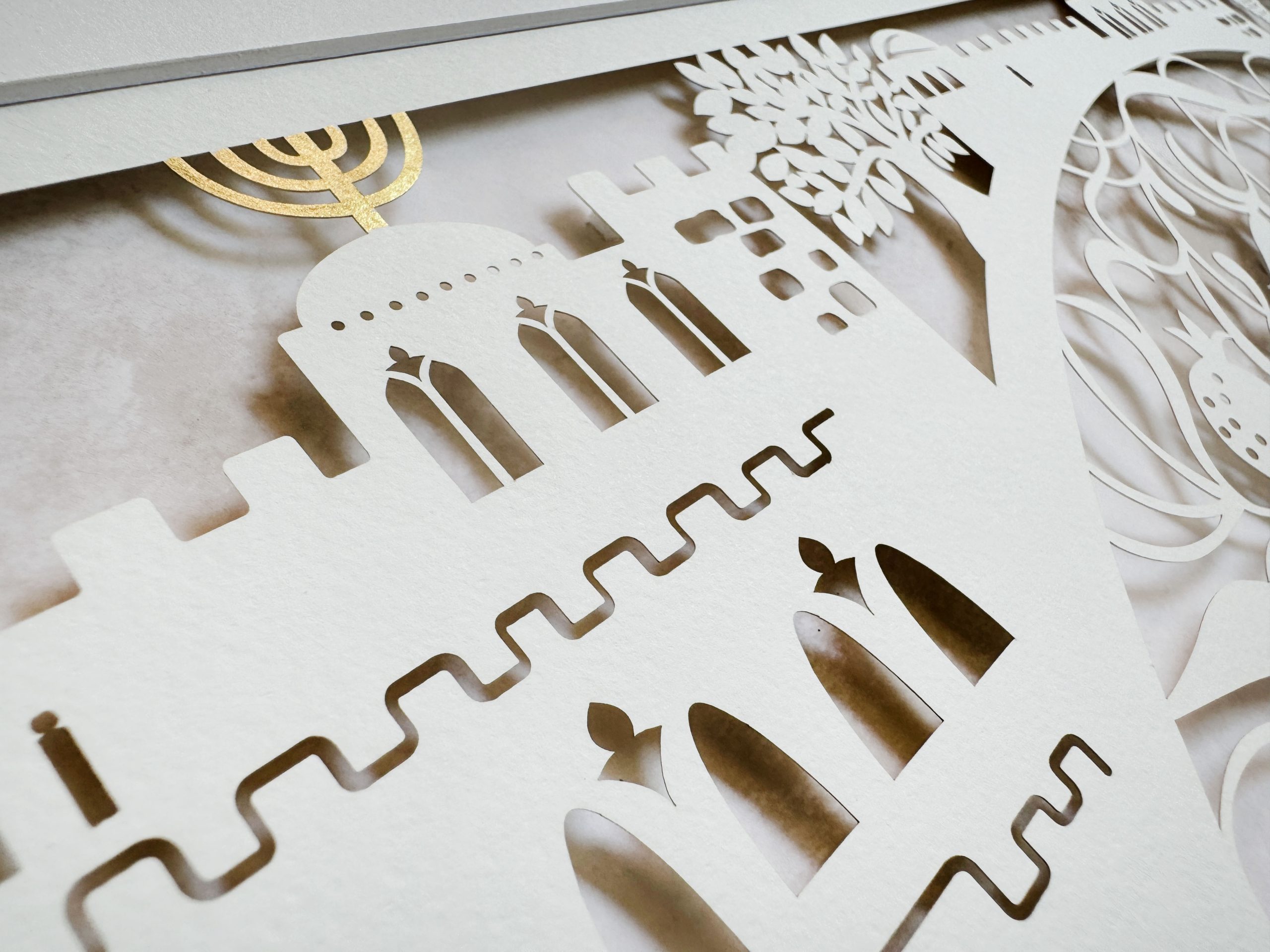 It is a cutout of Jerusalem. The gates sourrounding the old city, The western wall, Windmill, Menorah, David’s tower, The Rambans Synagogue AKA the “Hurva Synagogue” , Homes of Jerusalem, Leafs , flowers and swirkls.