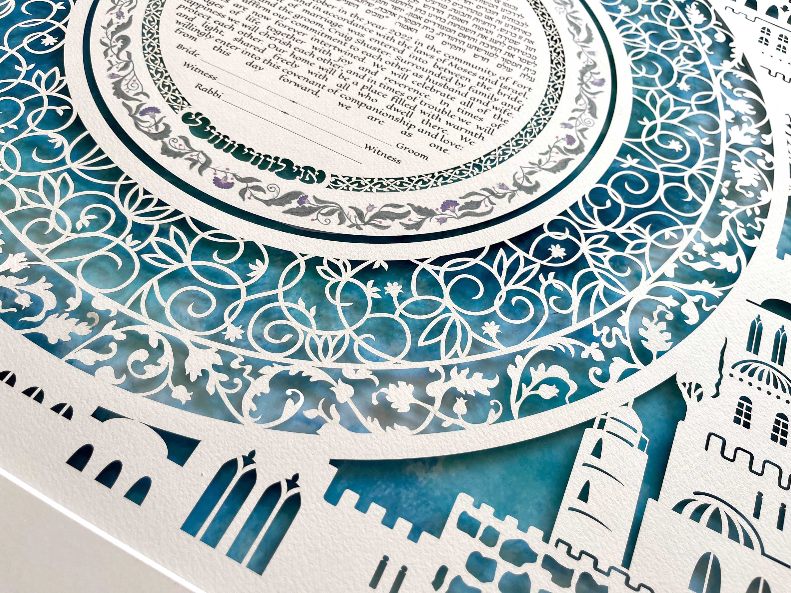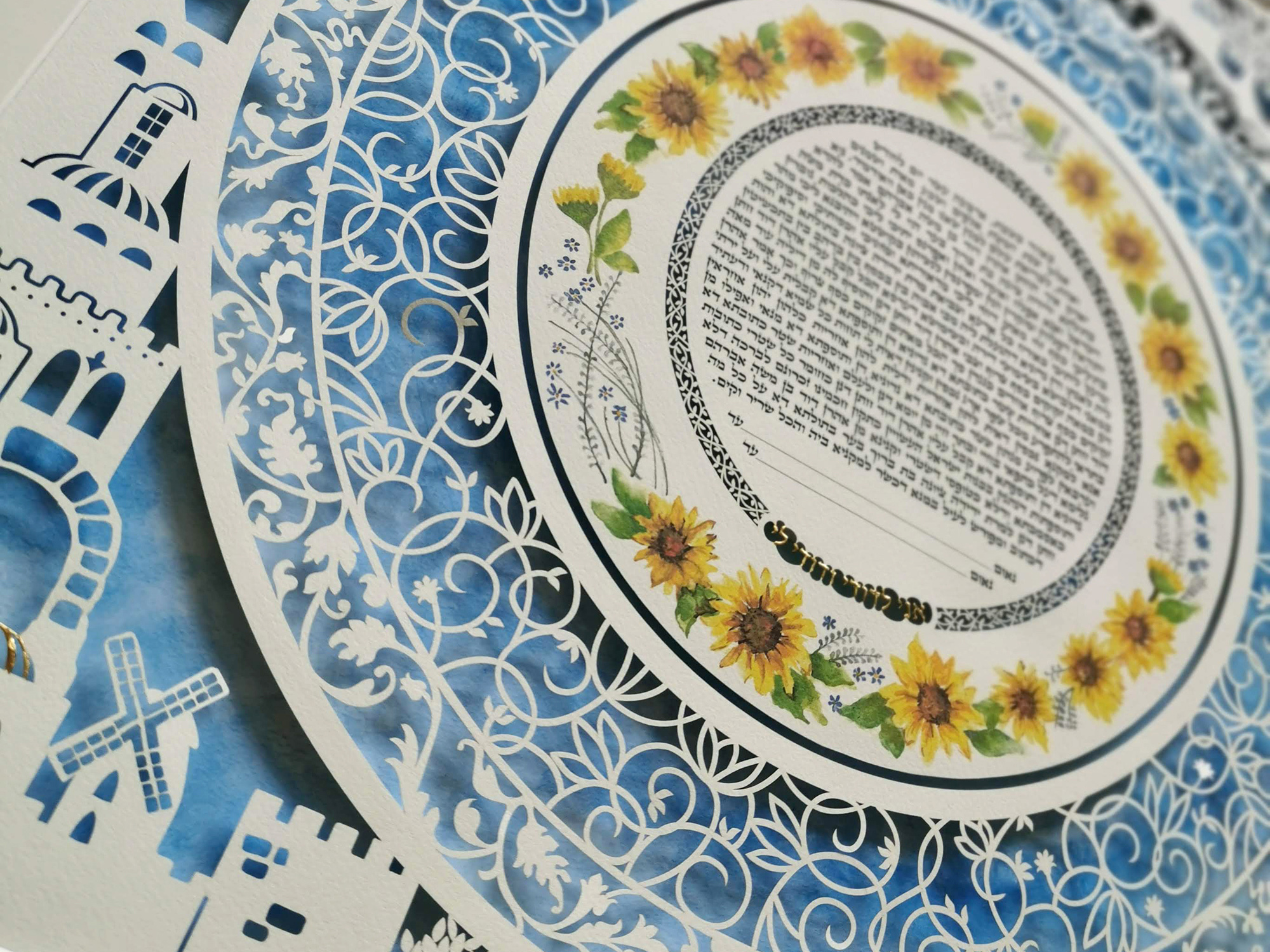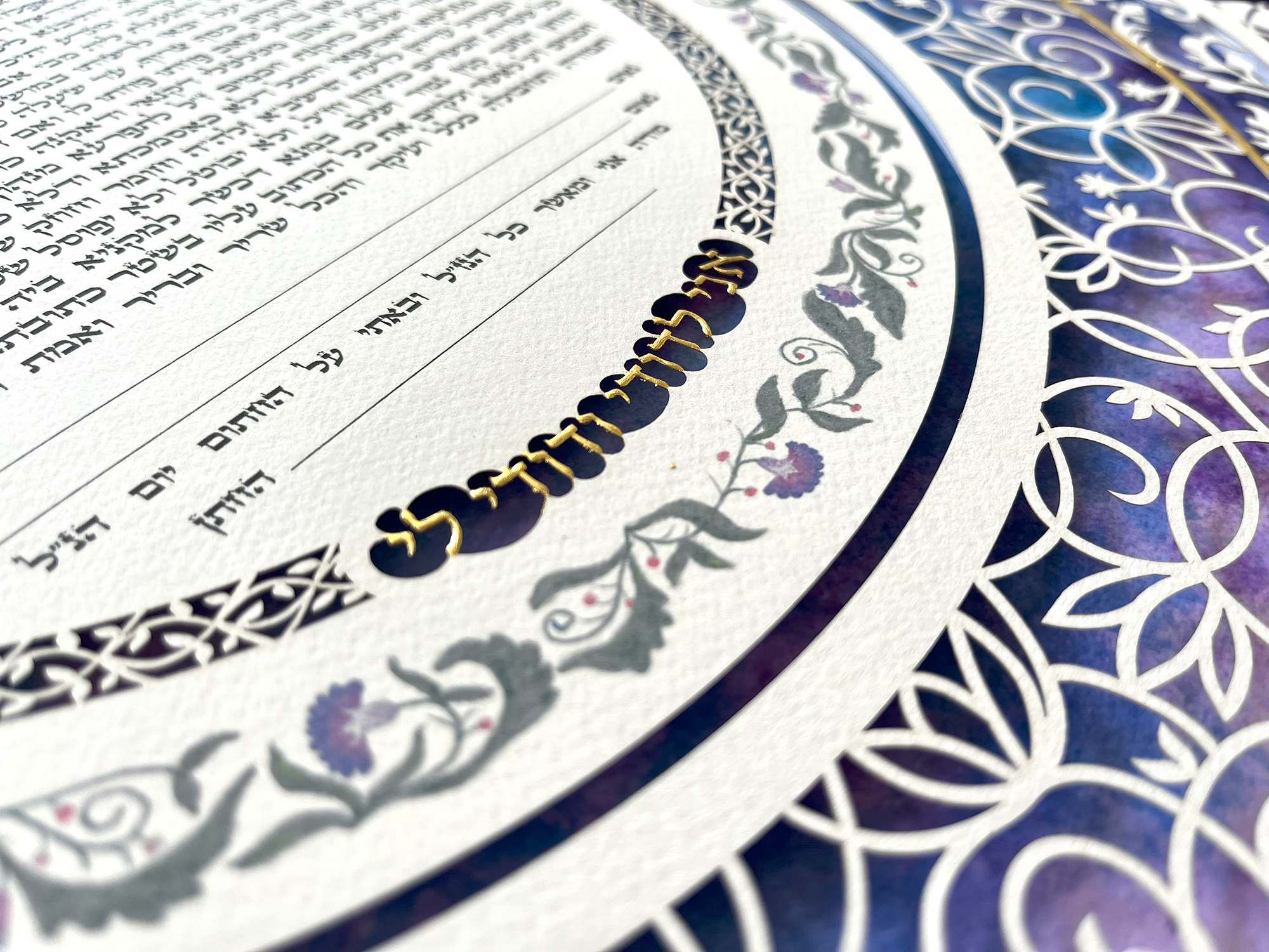 Our Ketubahs are cut out on fine art paper of the highest quality and the text, flower circle, and backround is printed on Gice Museum art paper.