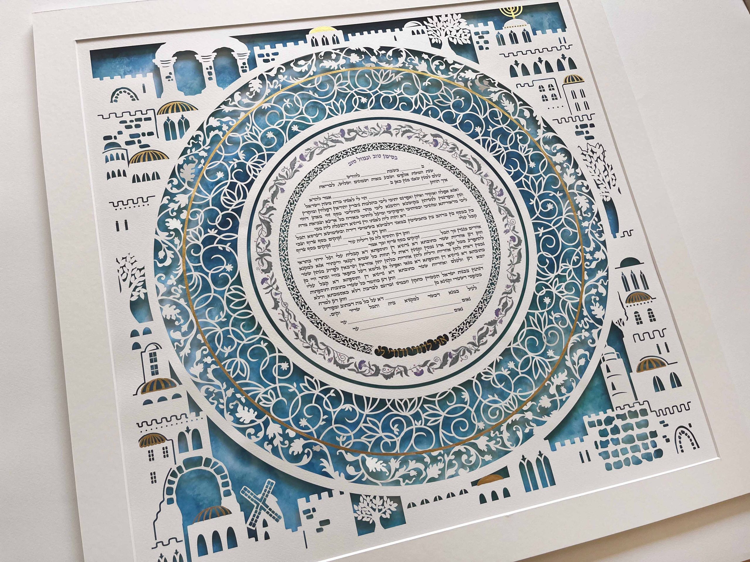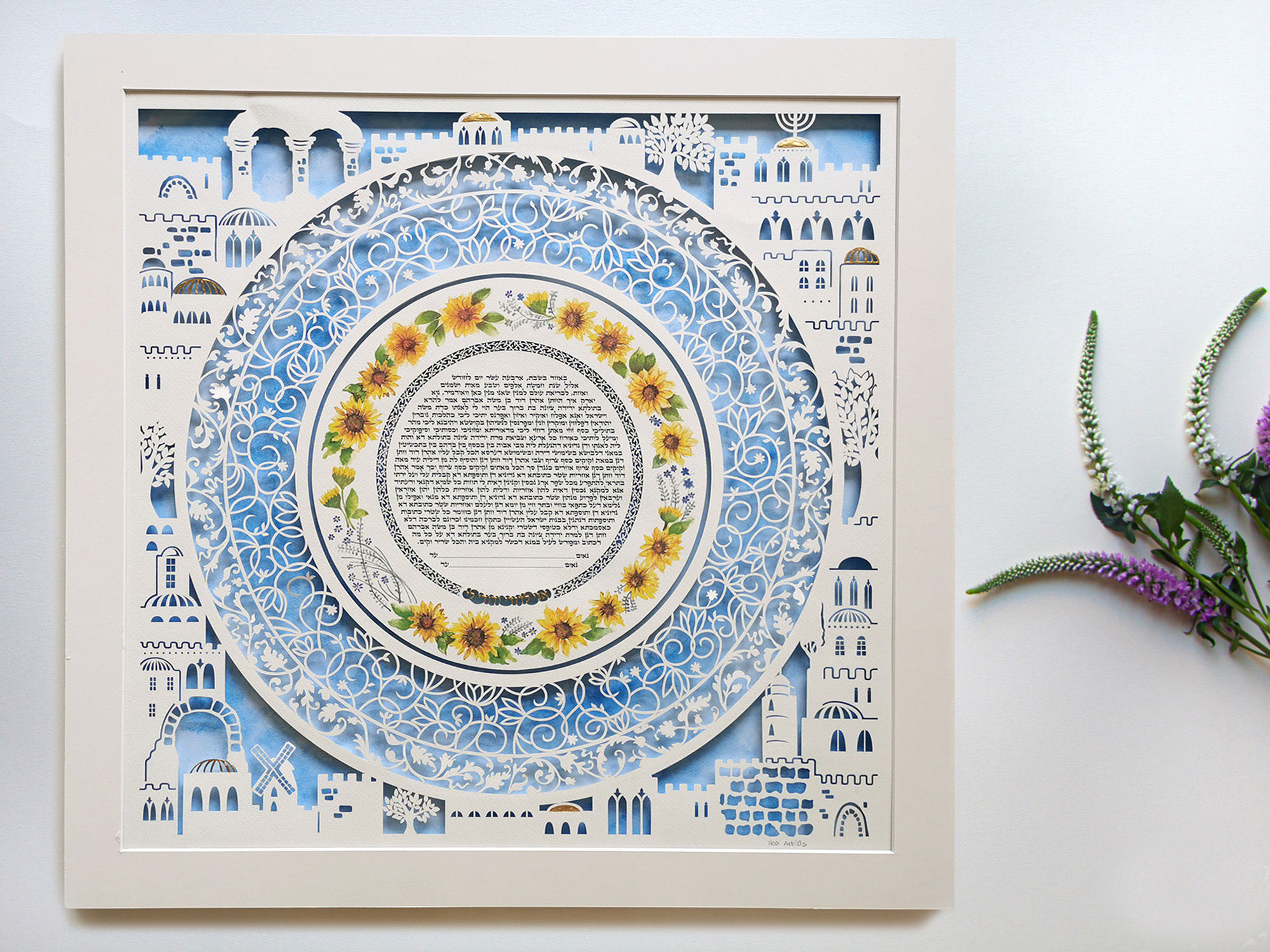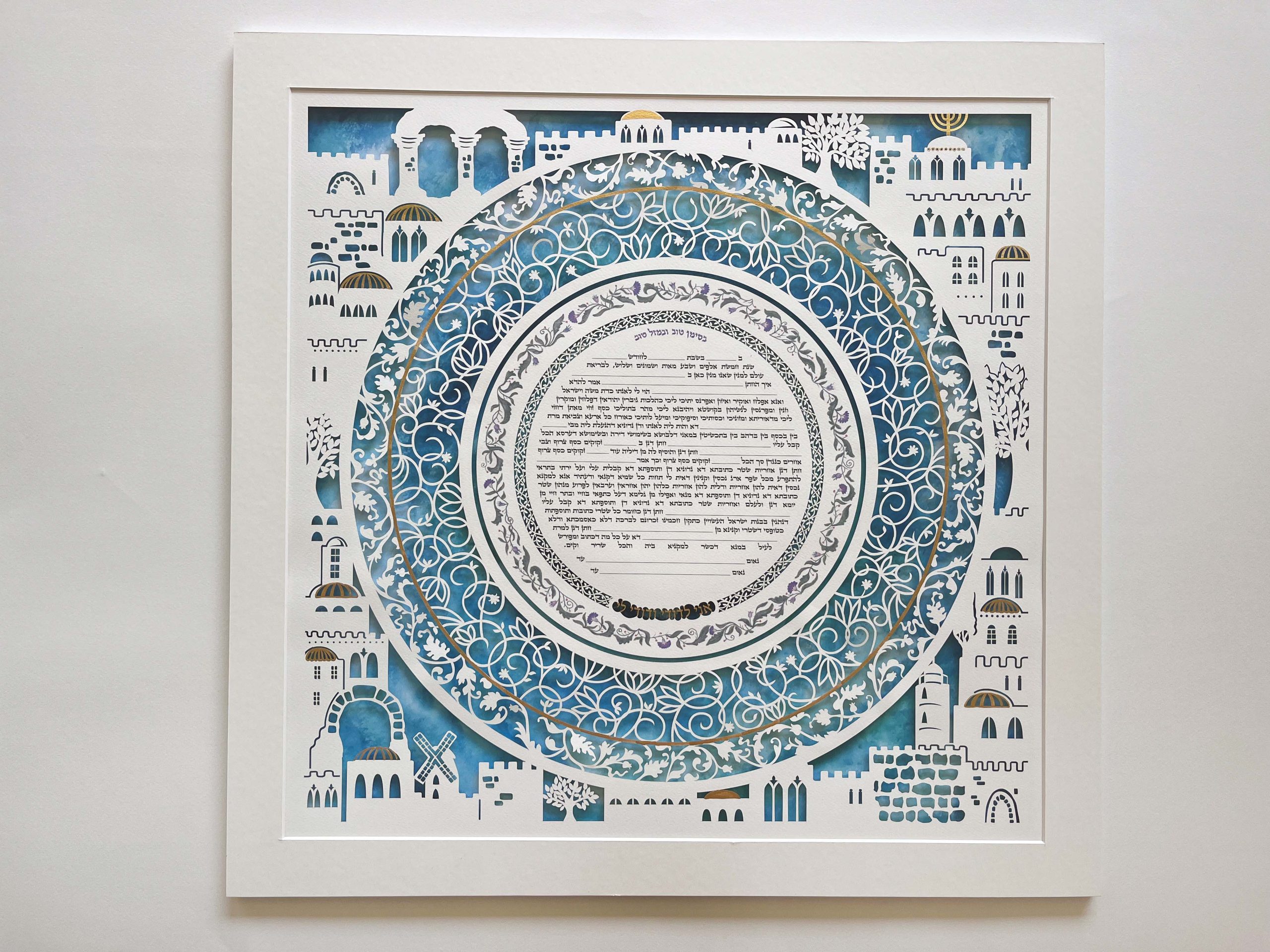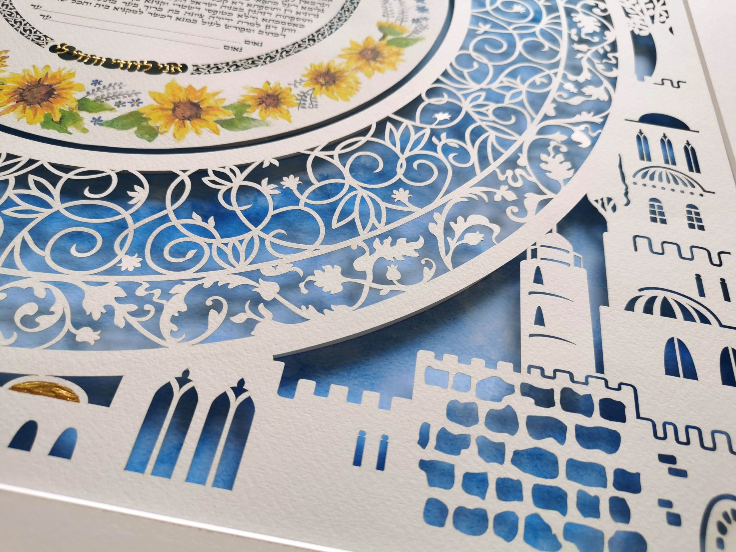 Our Ketubahs are cut out on fine art paper of the highest quality and the text, flower circle, and backround is printed on Gice Museum art paper.