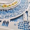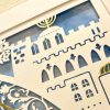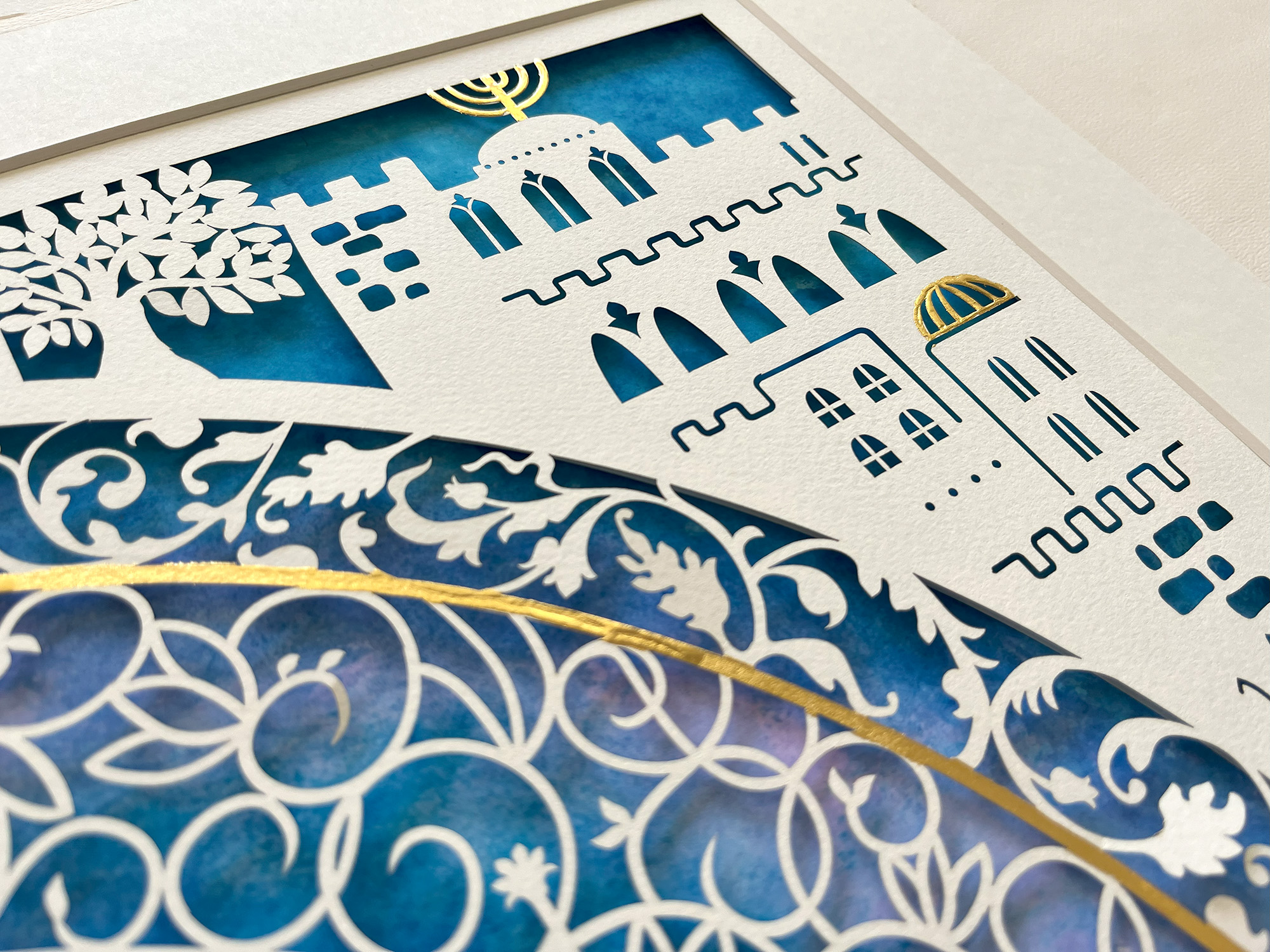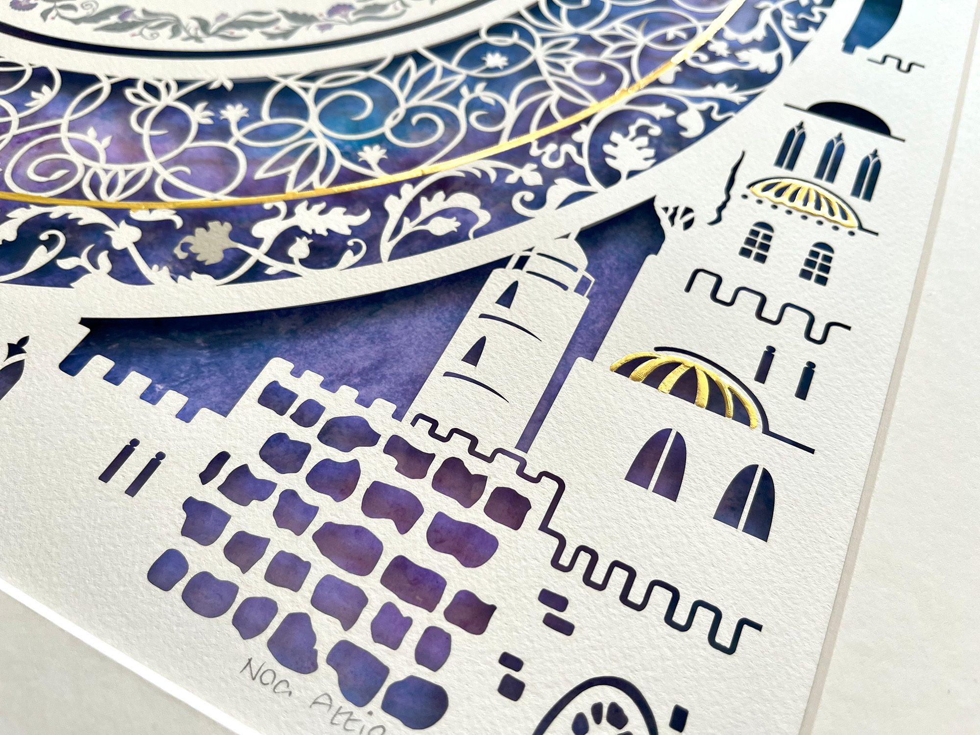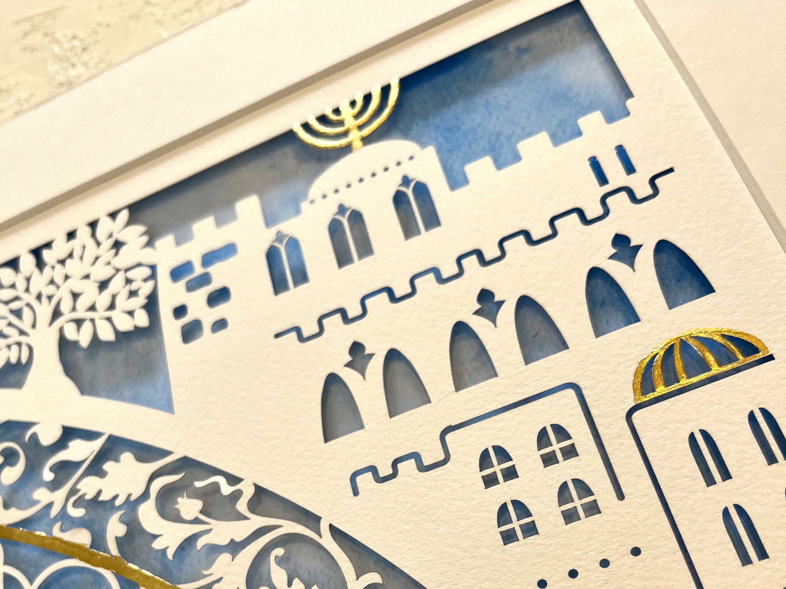 It is a cutout of Jerusalem. The gates sourrounding the old city, The western wall, Windmill, Menorah, David’s tower, The Rambans Synagogue AKA the “Hurva Synagogue” , Homes of Jerusalem, Leafs , flowers and swirkls.