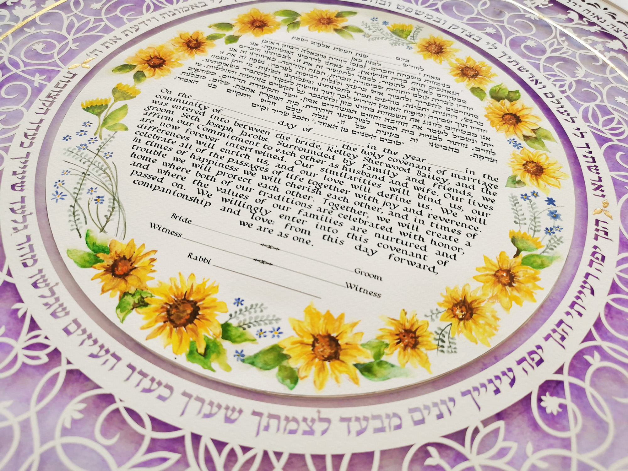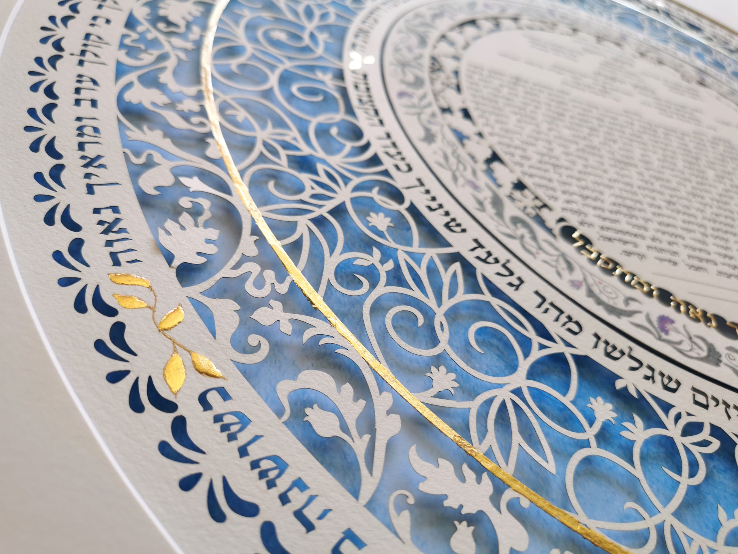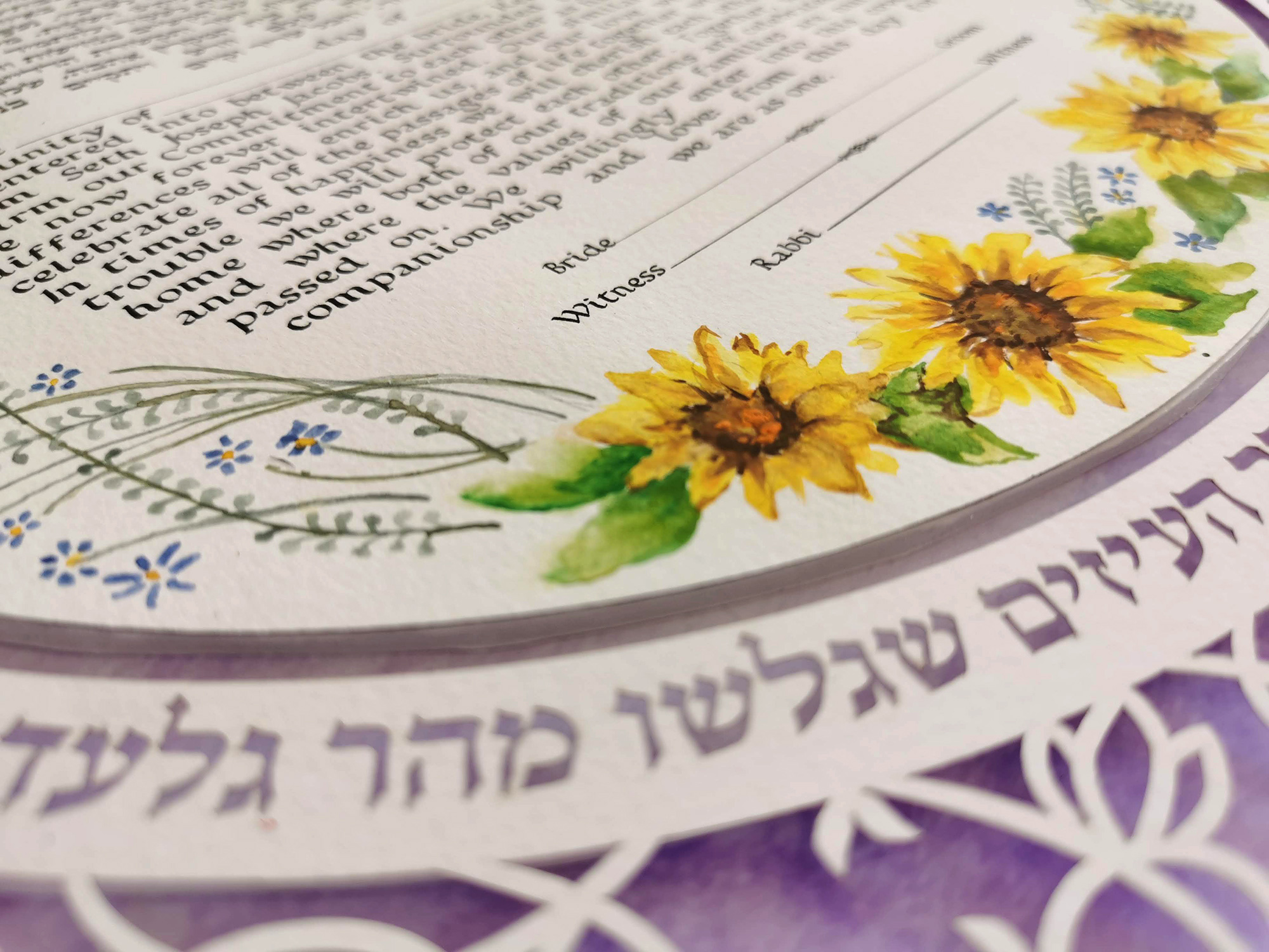 Our Ketubahs are cut out on fine art paper of the highest quality and the tex, flowers and Backround are printed on Gicle Museum art paper.