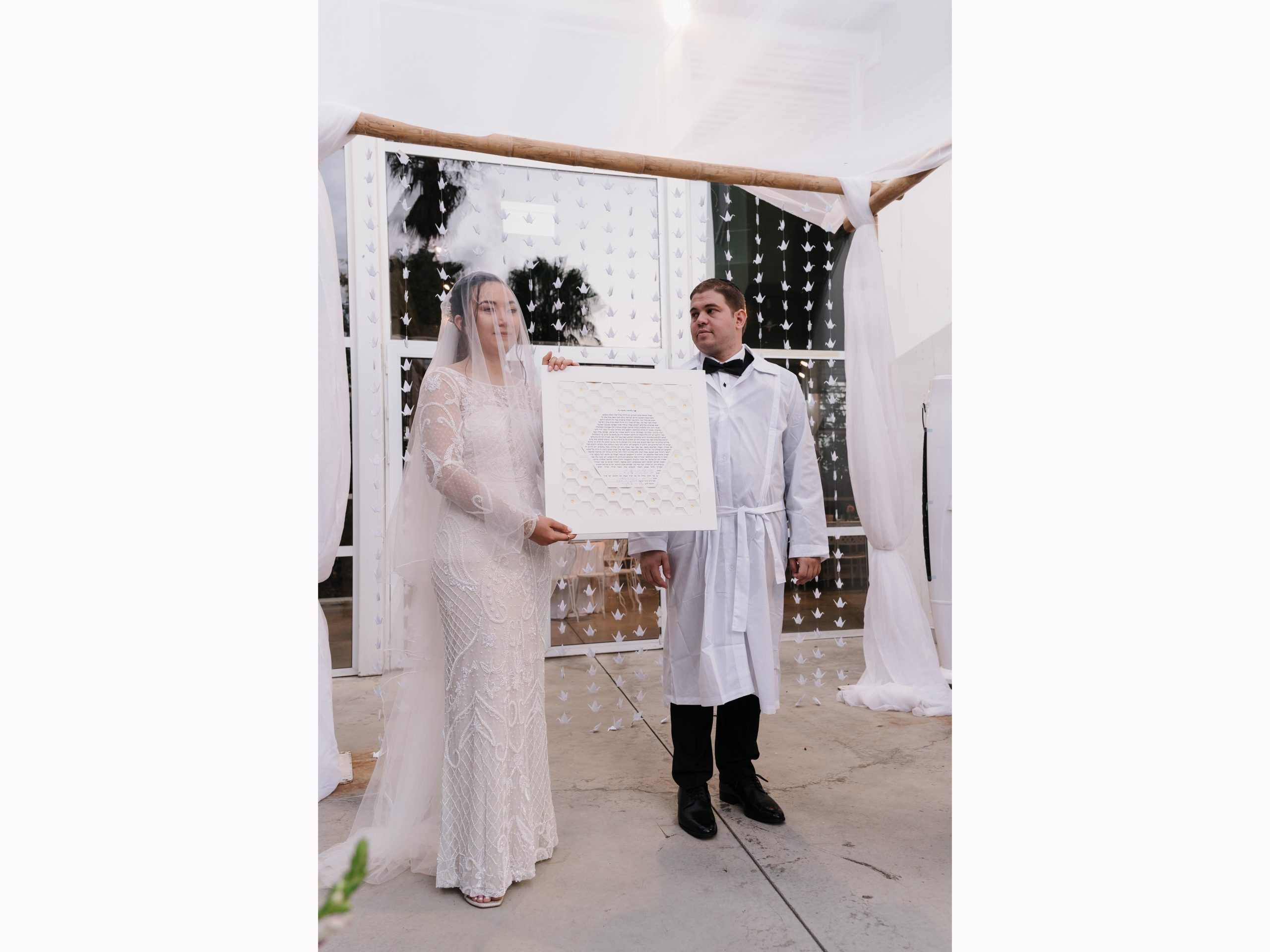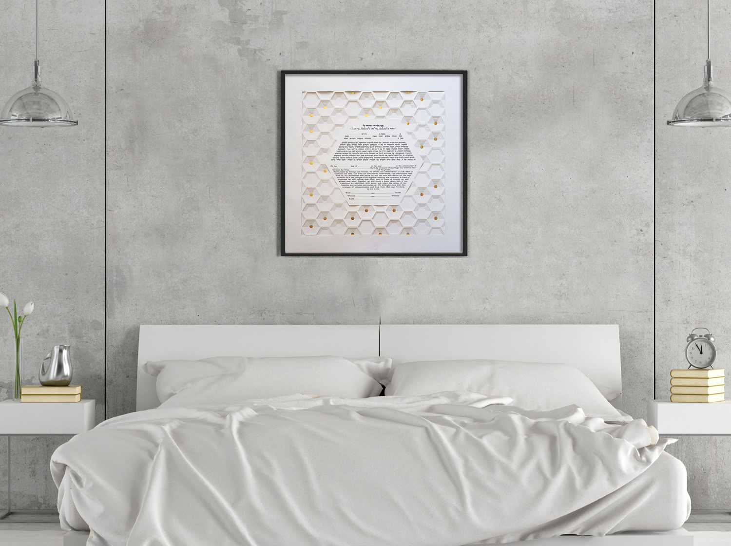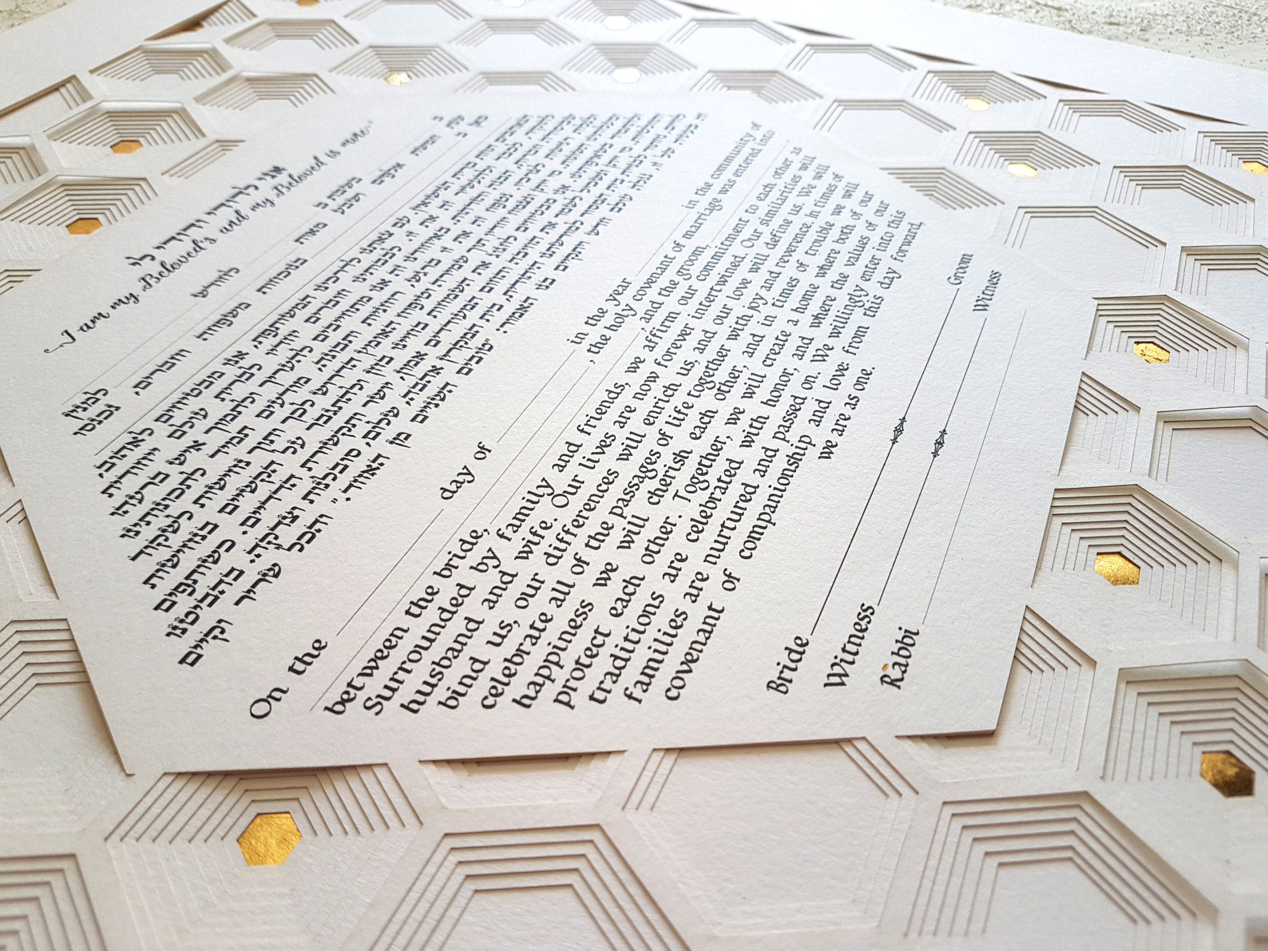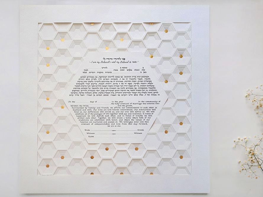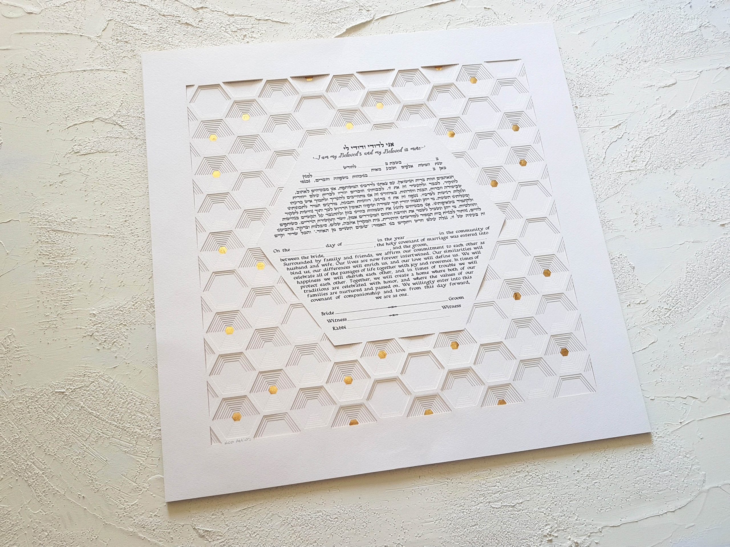 This “Golden Hexagon” ketubah made out of 10 layers and coated with 24k Gold leaf will be the perfect lifetime memory from your most special day, and the perfect wedding vows picture for you.
