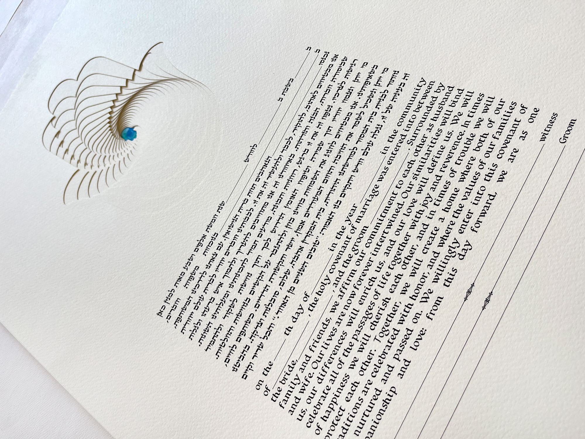 This marriage contract is a paper cut of a Hamsa made out of 26 layers and will be the perfect lifetime memory from your most special day. And the perfect wedding vows picture for you!.