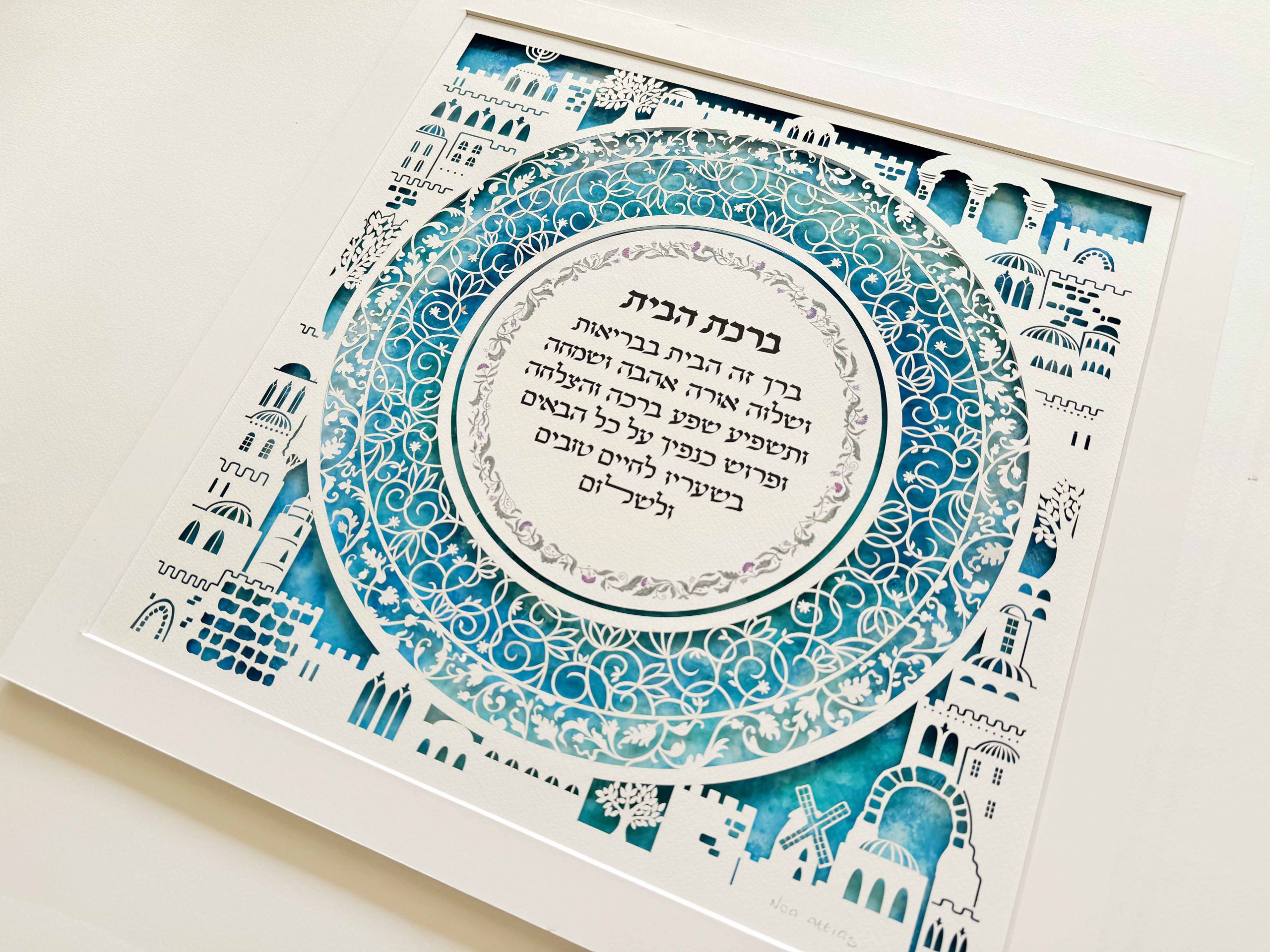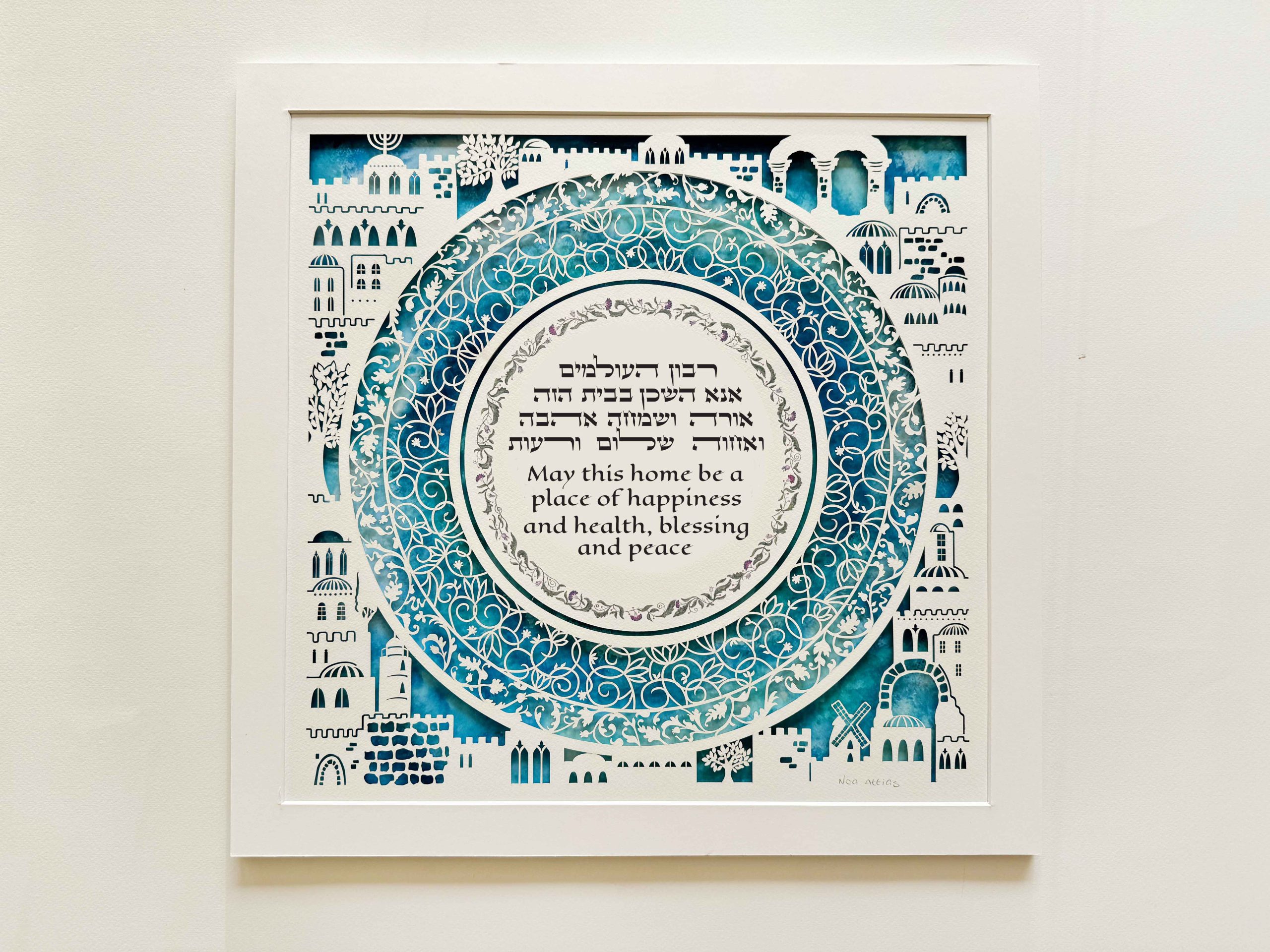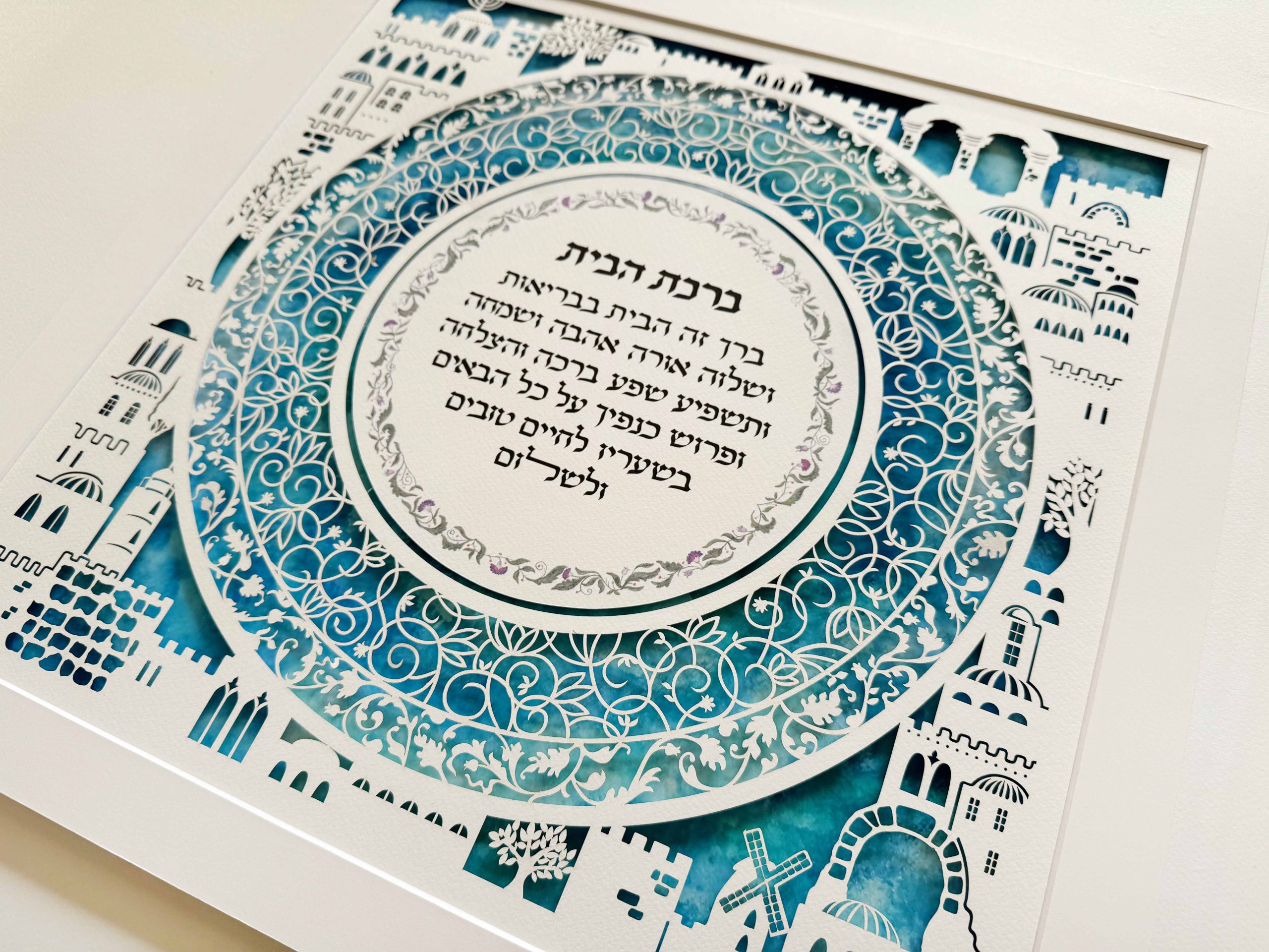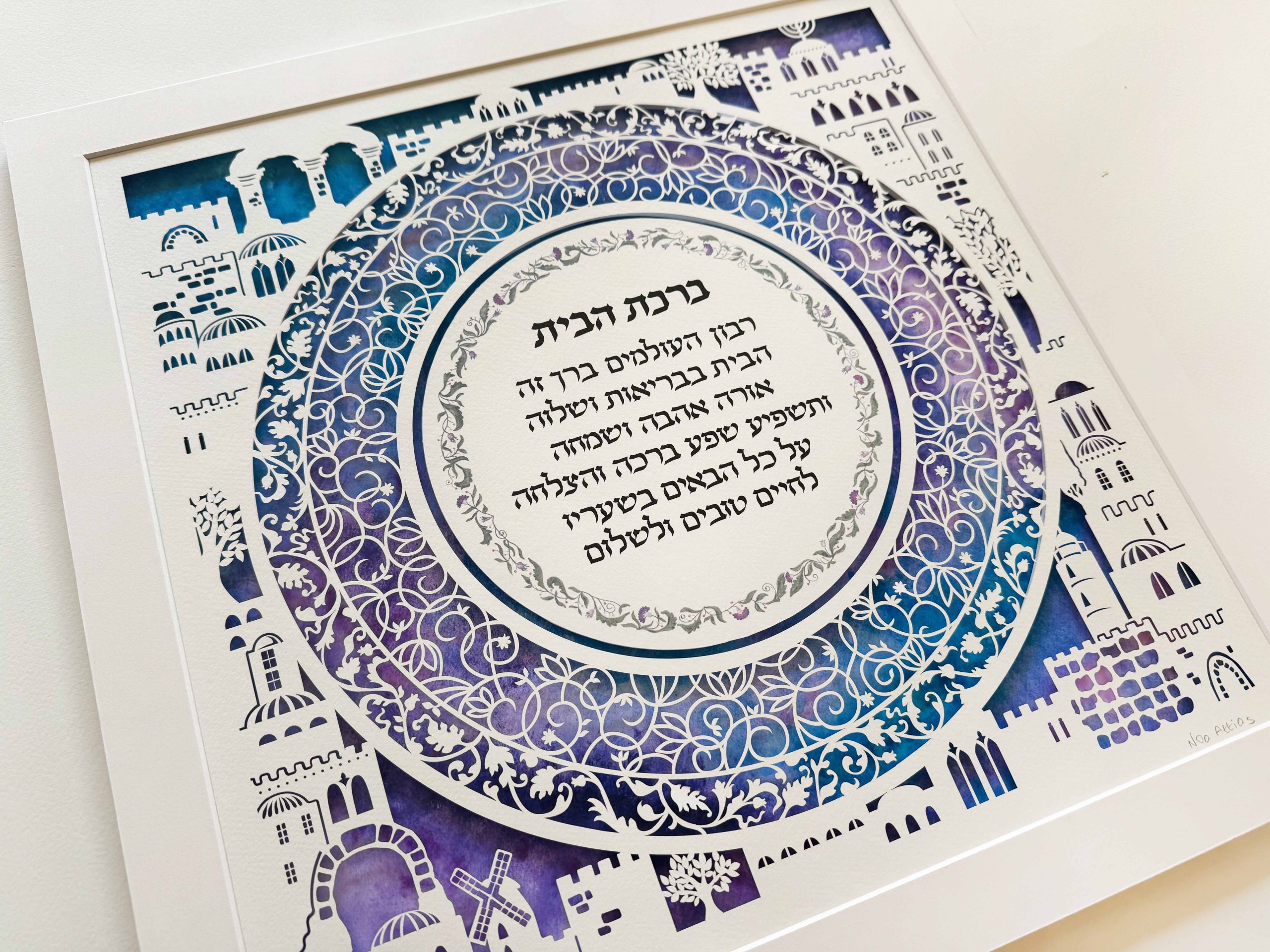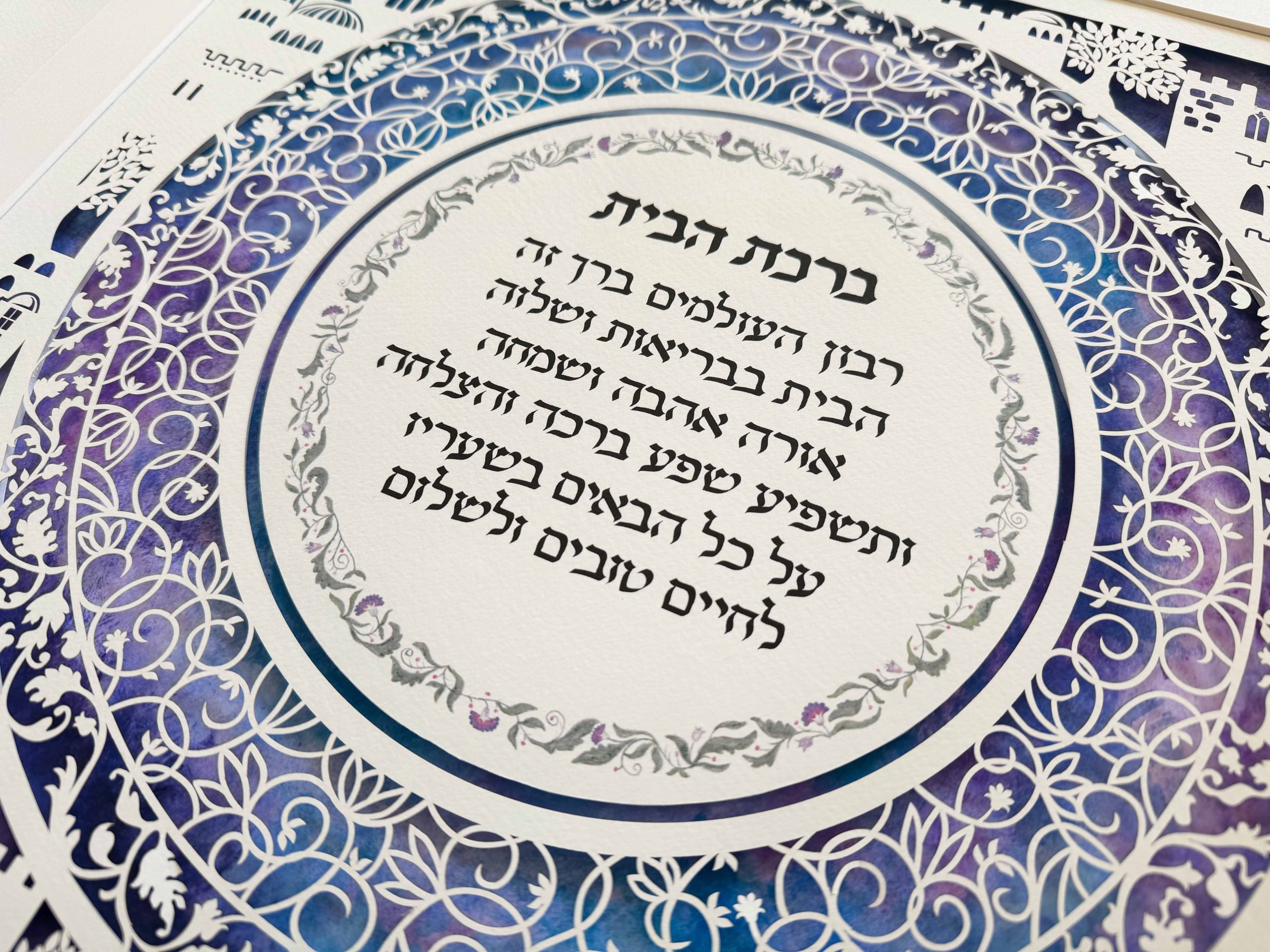 Pictured here with a custom text, the home blessing is offered with standard Hebrew text and the English translation is a positive variation on the traditional Jewish home blessing.