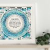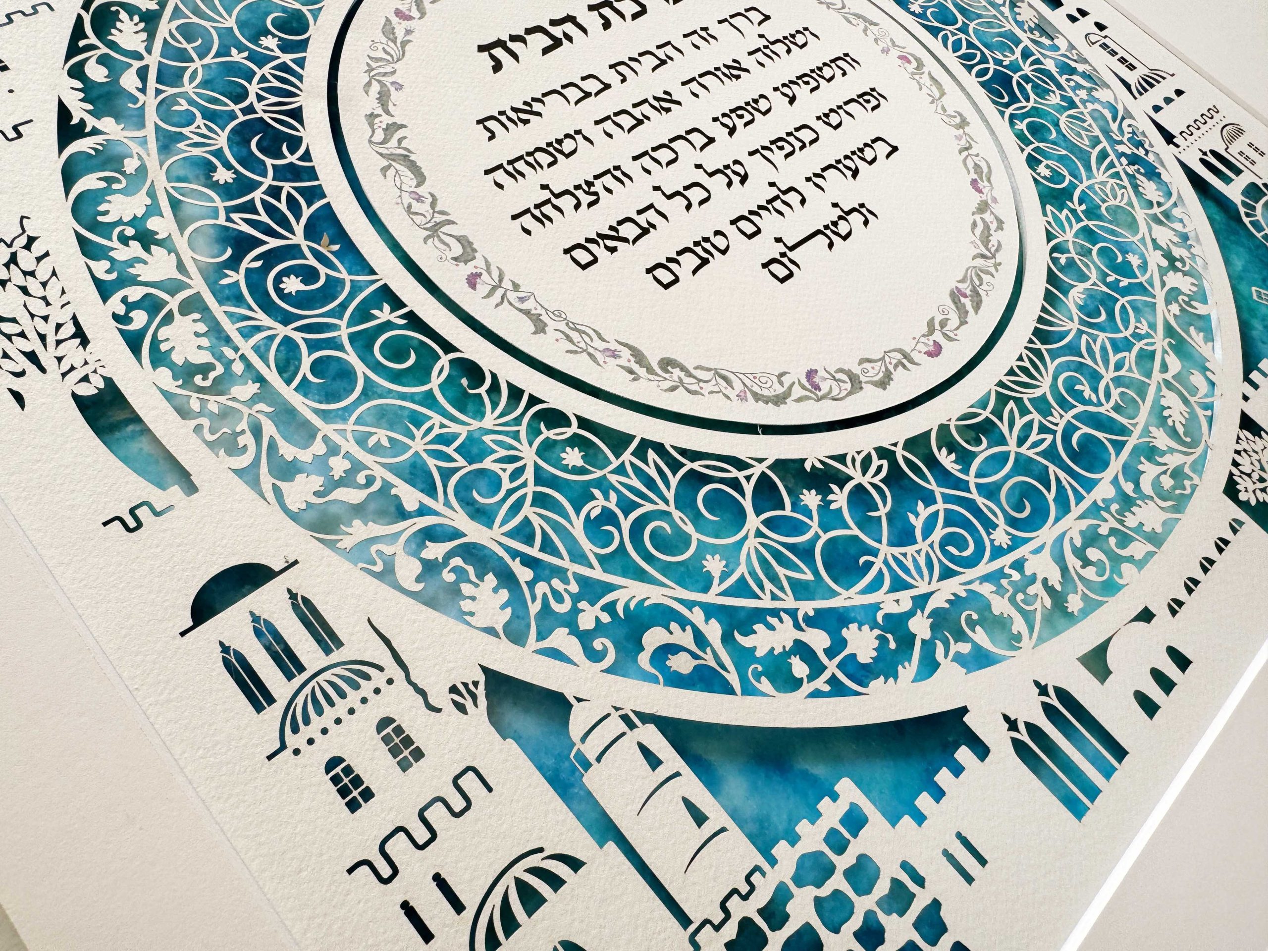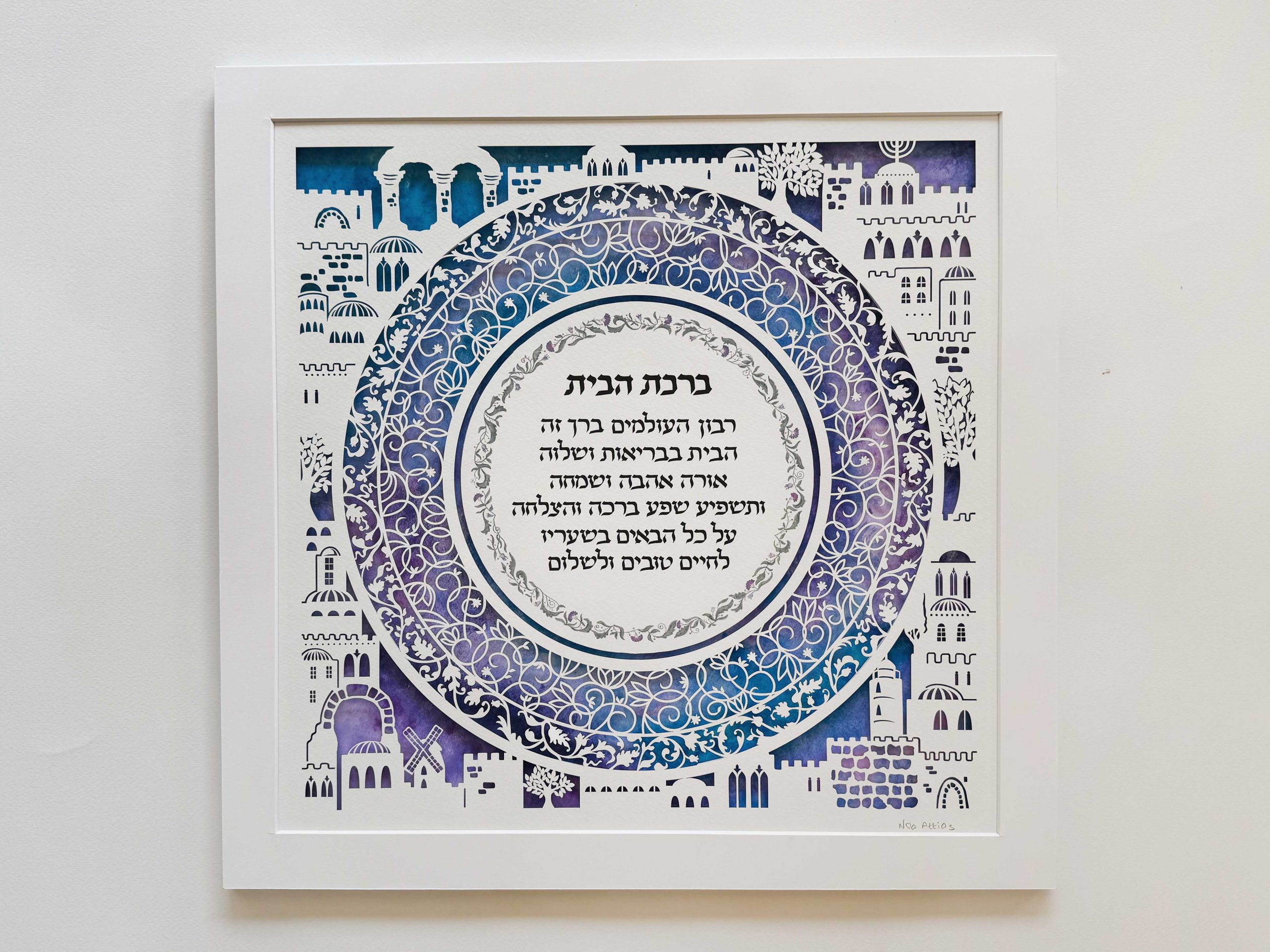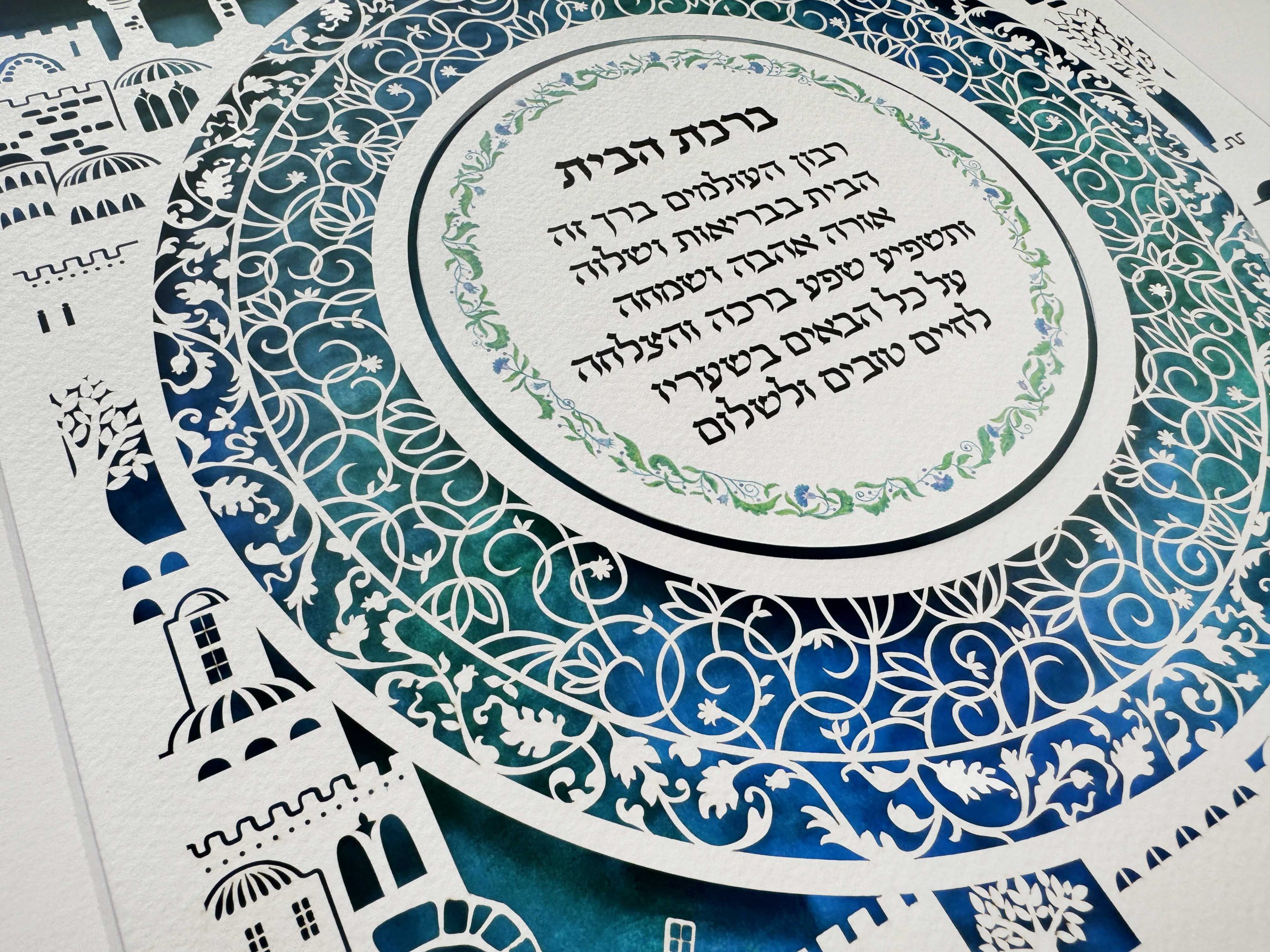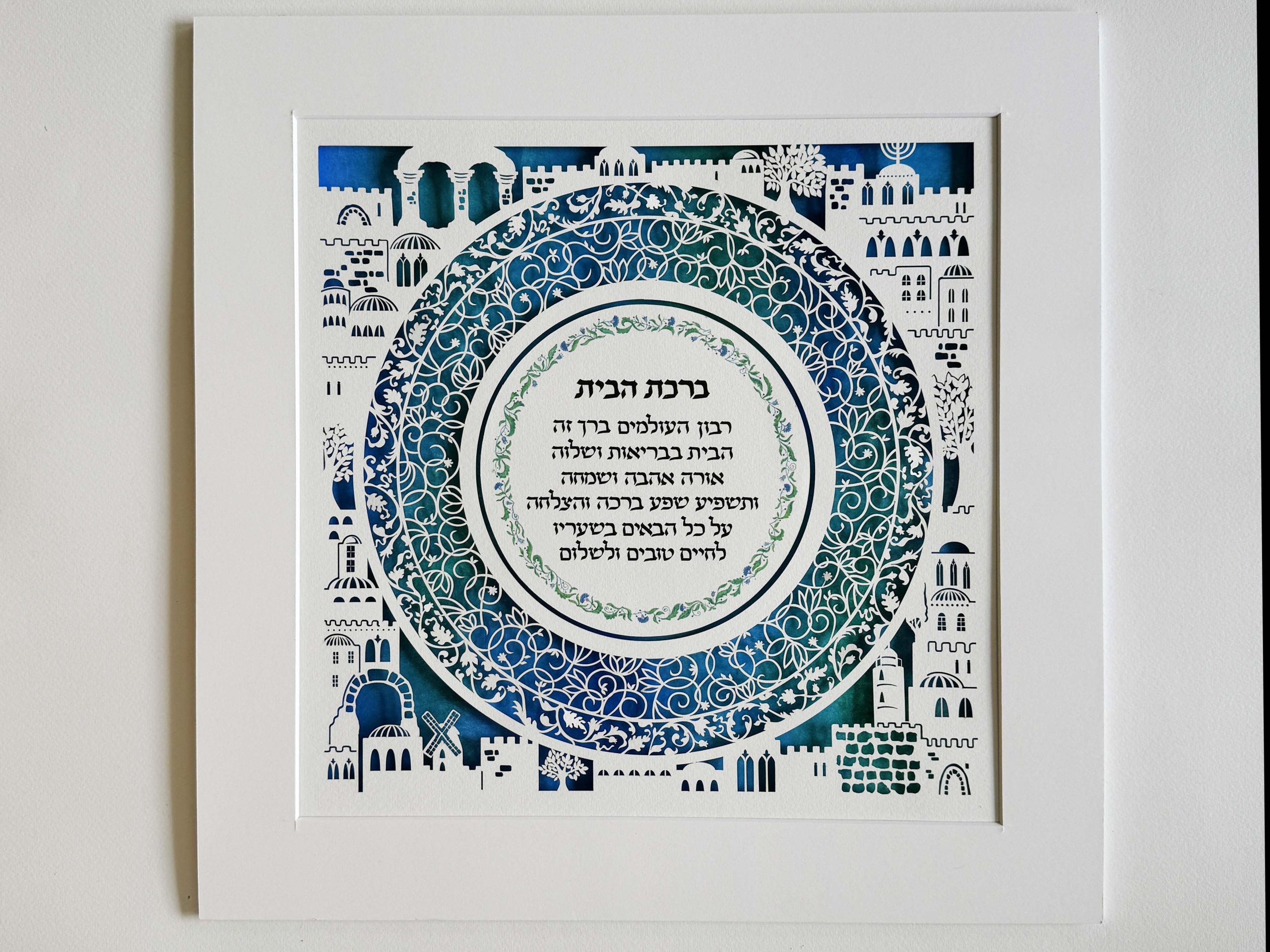 Pictured here with a custom text, the home blessing is offered with standard Hebrew text and the English translation is a positive variation on the traditional Jewish home blessing.