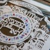 Around the center circle, there are hand painted leaves and flowers. and around it are the family names surrounded with a Jerusalem paper cut